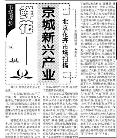 进入新世纪后,北京花卉业产值突破5亿元大关,成为本市重要产业。2001年,全市大中型花卉批发市场发展到20家,初步形成沿三环路的花卉交易流通圈。一区(县)一品的鲜花布局已形成:丰台的切花菊、朝阳的香石竹、海淀的彩色马蹄莲等逐步进入规模化、系列化。一批新兴的花卉产业基地蓬勃发展,如朝阳金盏花卉产业基地、通州新世纪园艺农场花卉基地等17家大型花卉生产基地初具规模。此外,花卉营销形式多样,从花卉进出口、贸易代理、大宗批发到超市连锁、花店专营、花卉租摆,几乎涵盖了所有传统营销模式,同时网上交易、拍卖、鲜花速递等现代交易手段非常活跃。(2002年1月7日《北京日报》1版,《京城四季花鲜艳》)