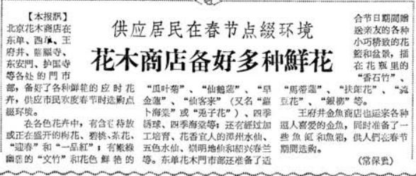 随着种植规模的扩大,北京在东单、西单、王府井、隆福寺等多地陆续开设了20多个鲜花商店,供应市场的花木从几十种增至上千种。那个时候,采购鲜花的主要是各大公共场所、外国使馆等。1959年春节前夕,黄土岗公社供应首都市场1.2万盆鲜花和可做花束、插瓶用的花签。其中,鲜花多是小盆栽植,适合室内摆放,价格也比往年便宜,如海棠从往年的每盆两角五分降至两角,引得不少市民前去购买。(1959年1月27日《北京晚报》4版,《黄土岗公社供应大量鲜花》)1961年春节前,漳州水仙、绍兴春兰等应季花卉进入北京,东单花木门市部还准备了适合赠送亲友的各种花篮和盆景,受到市民欢迎。(1961年2月8日《北京晚报》2版,《花木商店备好多种鲜花》)