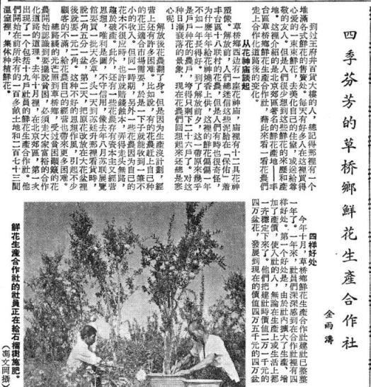 新中国成立后,花卉生产焕发出勃勃生机。1954年,草桥乡14户花农自动组织起来,成立了全国第一个鲜花生产合作社,并新建起273间温室,栽种了200多种约3万盆鲜花。(1955年3月7日《北京日报》2版,《四季如春的鲜花生产合作社》)