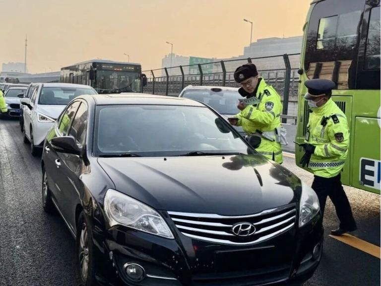 早上8点半,在京通快速路进京方向双桥收费站入口处路面较宽的路段,交警拦停多辆没有悬挂号牌的临牌车辆,每辆车上都有不止一位乘客。