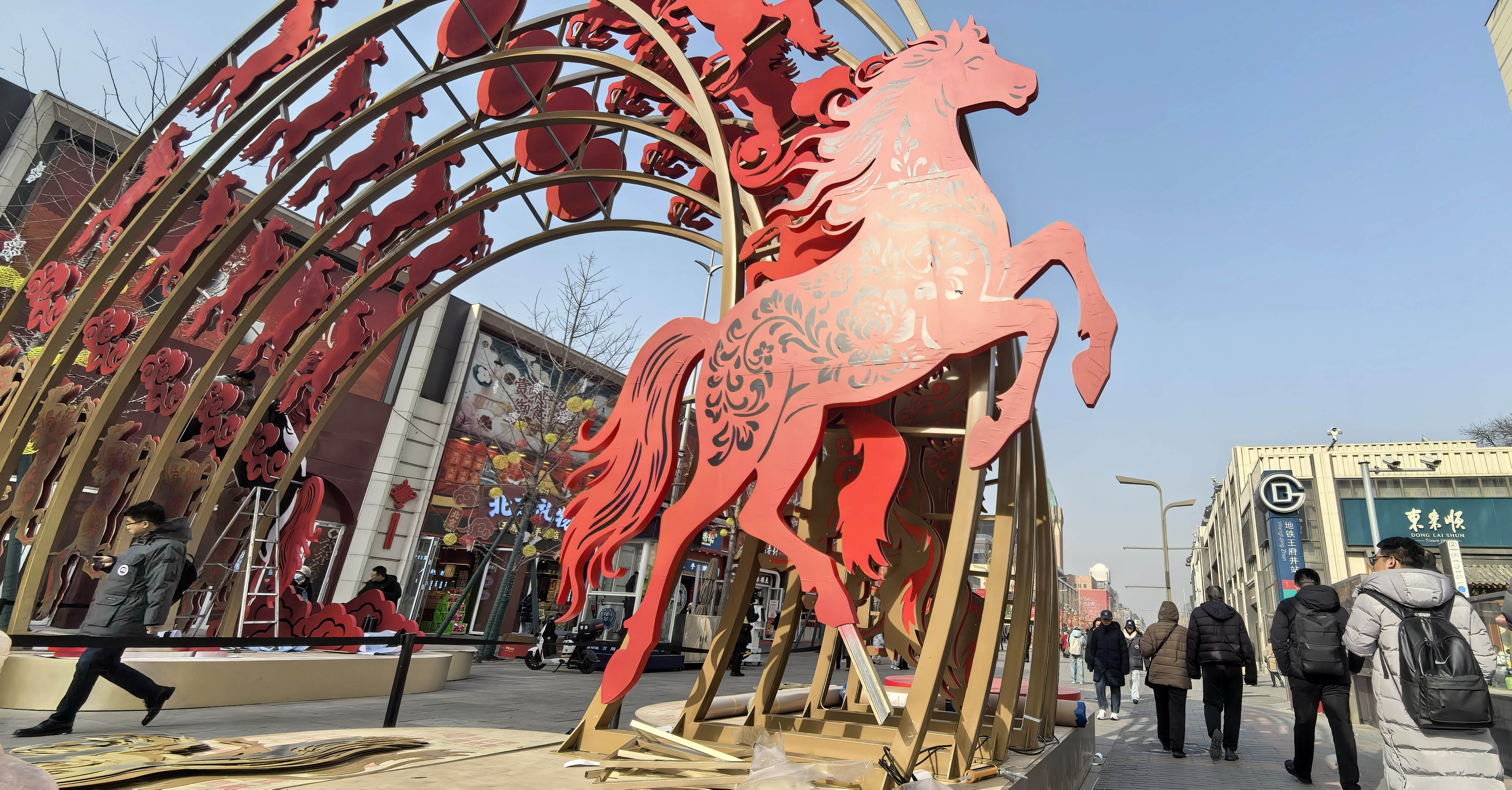 ↑这是王府井商业街上的马年特色彩门(1月15日摄)。
