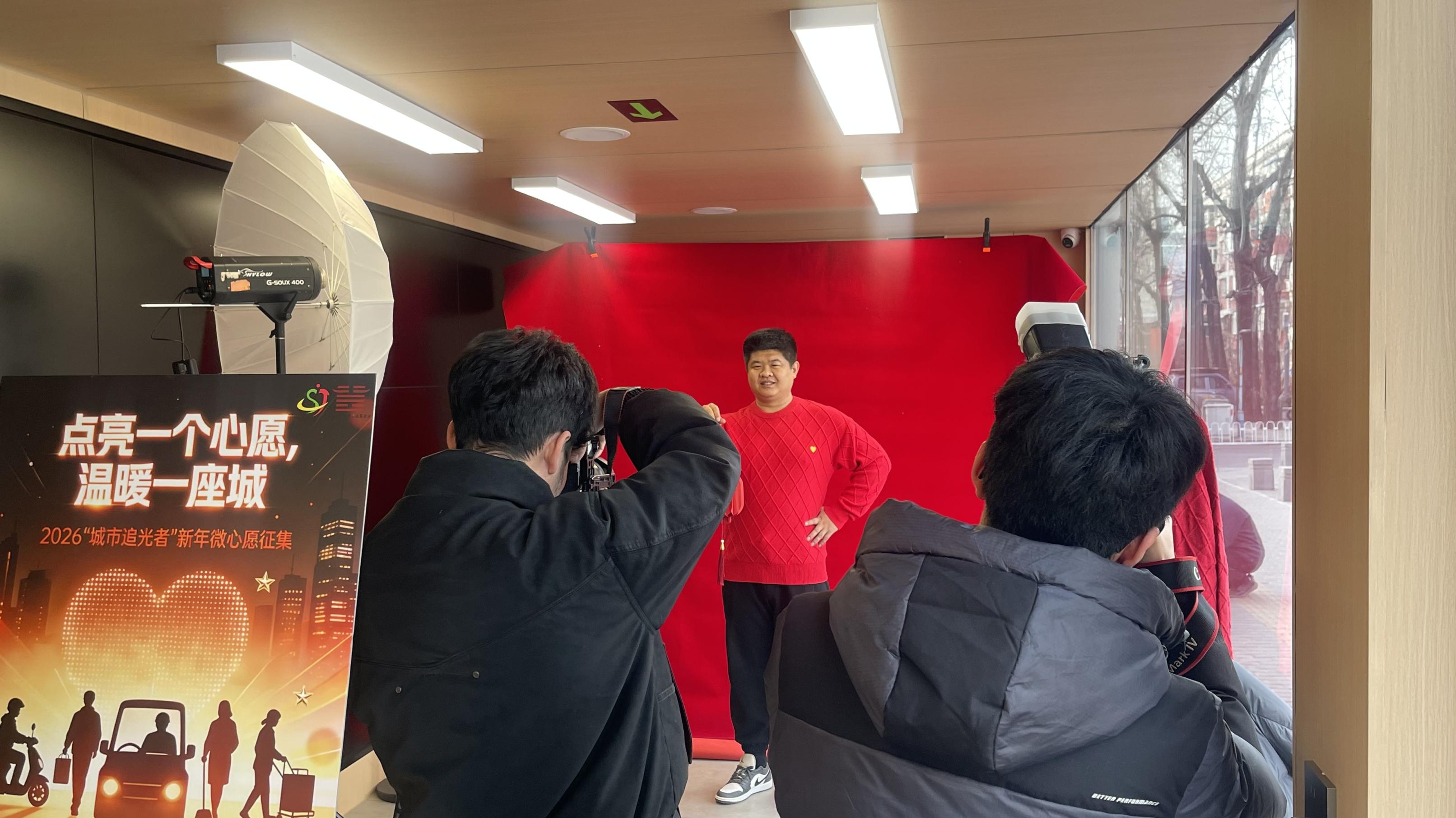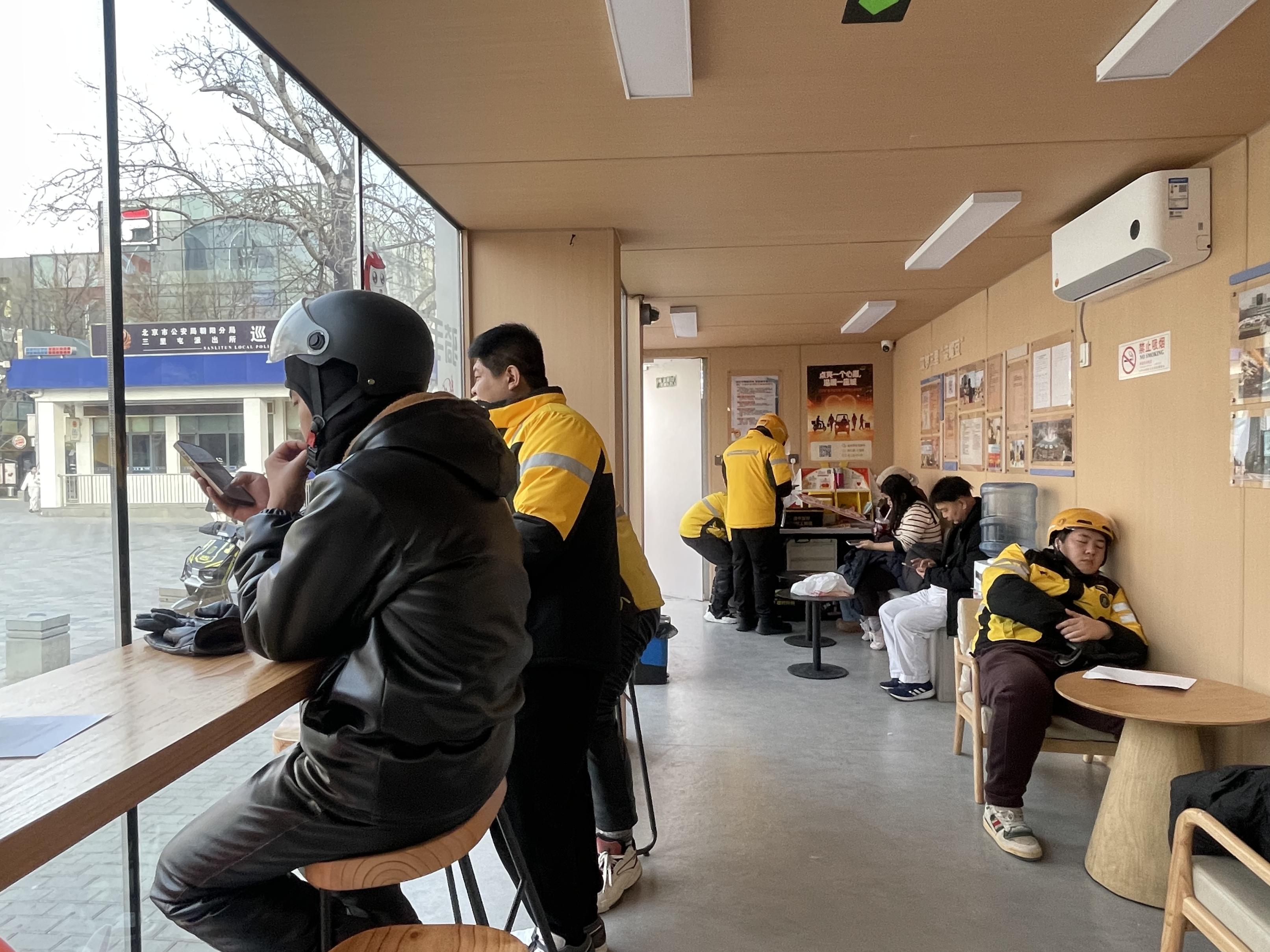 下午2点半,送餐高峰已过,朝阳区三里屯骑手驿站内,几名外卖员正靠在椅子上小憩。墙角的红色背景布有些抢眼——这是街道为新业态劳动者送来的“新春暖心礼”,免费的艺术照拍摄让骑手们感受到春节已经临近。