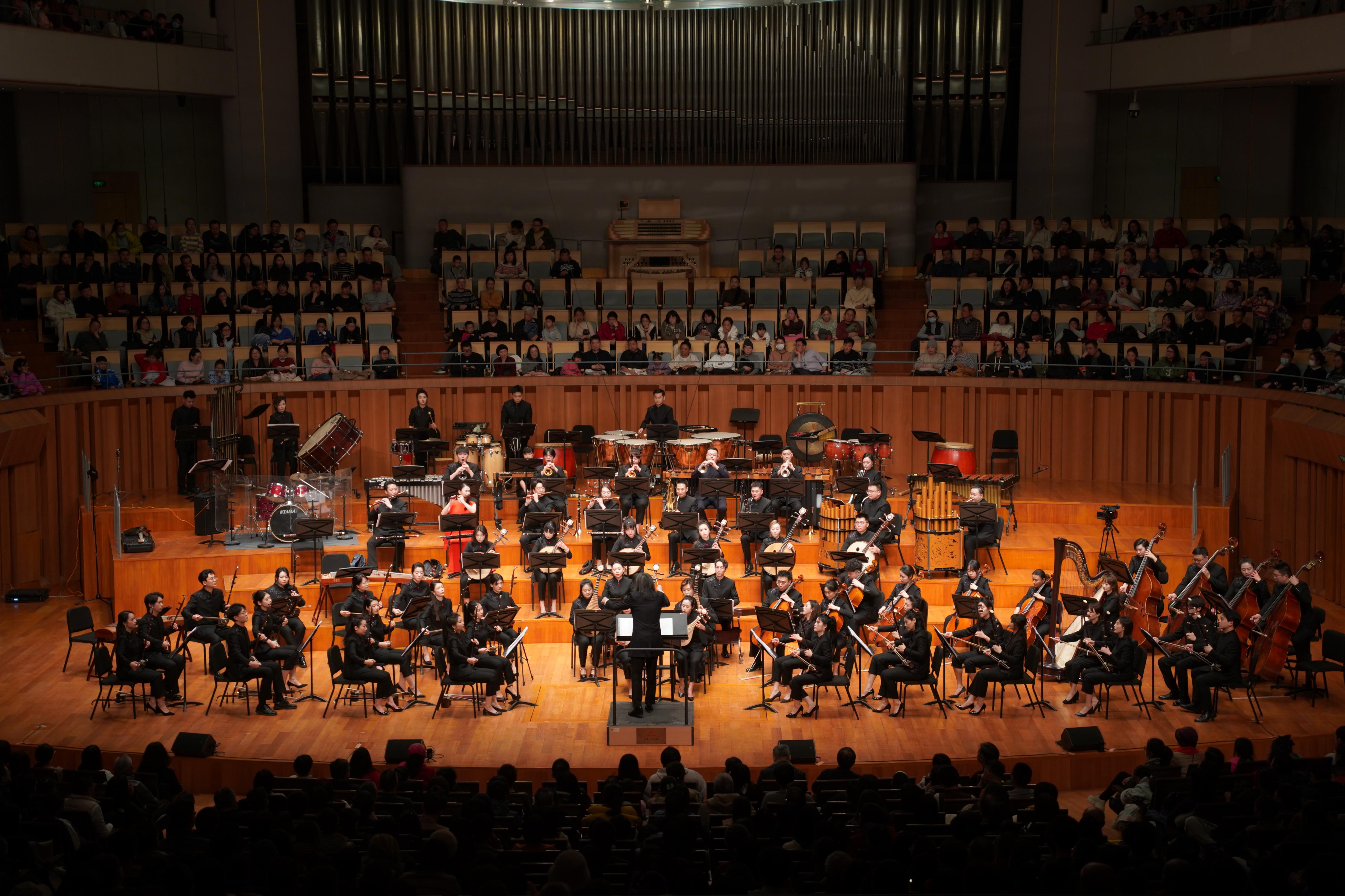 音乐会由乐团首席指挥张鸣执棒,在《序曲联奏》中热烈开启,《庆典序曲》《春节序曲》《节日序曲》精彩片段接连奏响,明亮、喜庆的旋律瞬间点燃了新年的节日氛围。随后,芦笙与乐队《侗寨狂欢夜》、琵琶协奏曲《妙音三则》、竹笛曲目《喜相逢》《扬鞭催马运粮忙》等或原生态或新颖或经典的曲目次第上演。