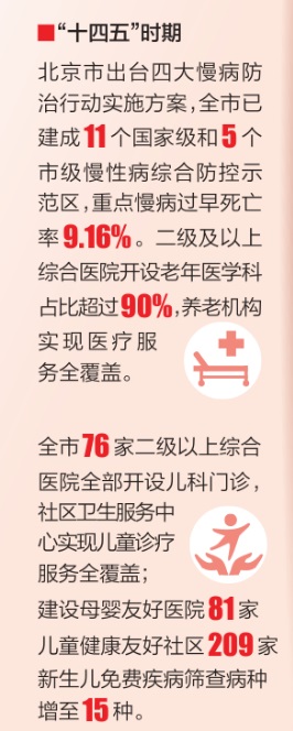 健康是人民群众共同的追求,也是幸福生活的重要基础。“十四五”时期,北京持续完善医疗卫生服务体系,全生命周期保障居民健康。北京市在“十五五”规划建议中提出,加强“一老一小”服务,发展医育、医养结合服务;强化慢性病“防筛管救治康”综合防控,加强儿科、老年医学、心理健康和精神卫生服务,优化精神障碍患者服务管理。