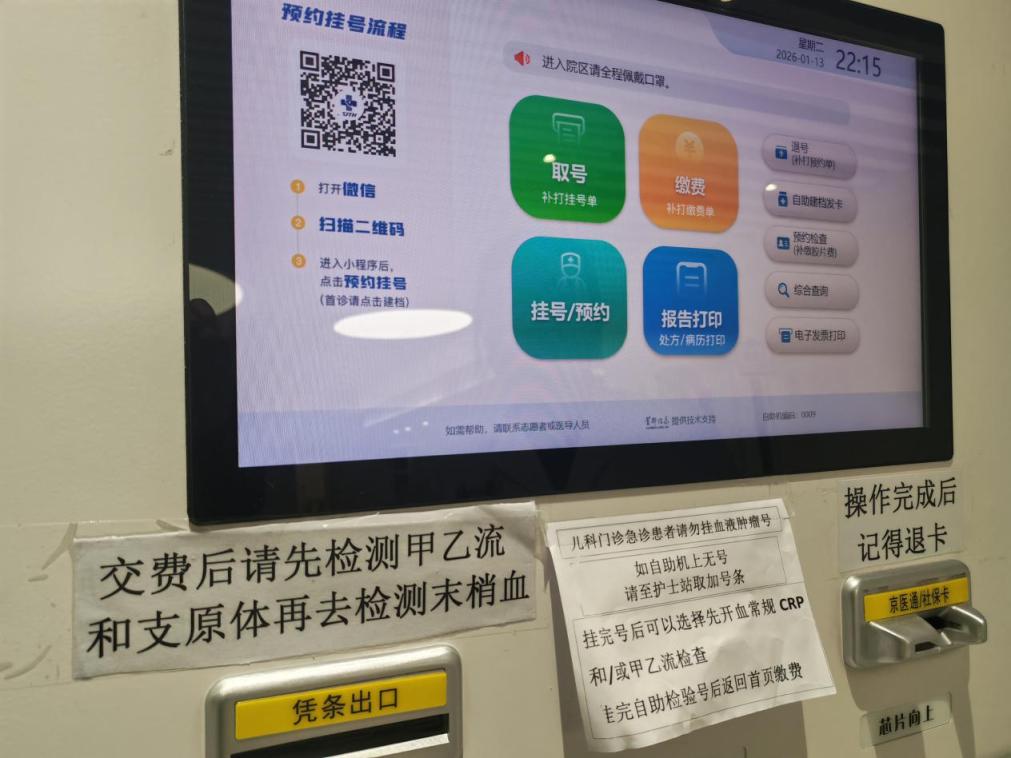 家住医院附近的李先生,有些焦急地带着发烧的孩子前来就诊。与过去“先找医生,后去检查化验”有所不同,李先生在自助机上挂号结束后,便直接选择了血常规检查项目。为了应对每年秋冬季比较高发的呼吸道感染疾病,北京世纪坛医院从2025年11月起,便主动协调技术手段,在儿科自助服务一体机上,增加了自助可选检查项目的功能模块。患者既可以在挂号后先见医生,也可自己先开常规检查项目,而后再找医生就诊。