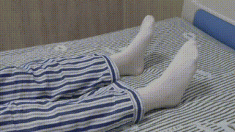 缓缓将脚尖朝向自己鼻子的方向勾起,感觉小腿前方肌肉绷紧,脚跟可稍微离床或离地。保持5—10秒。