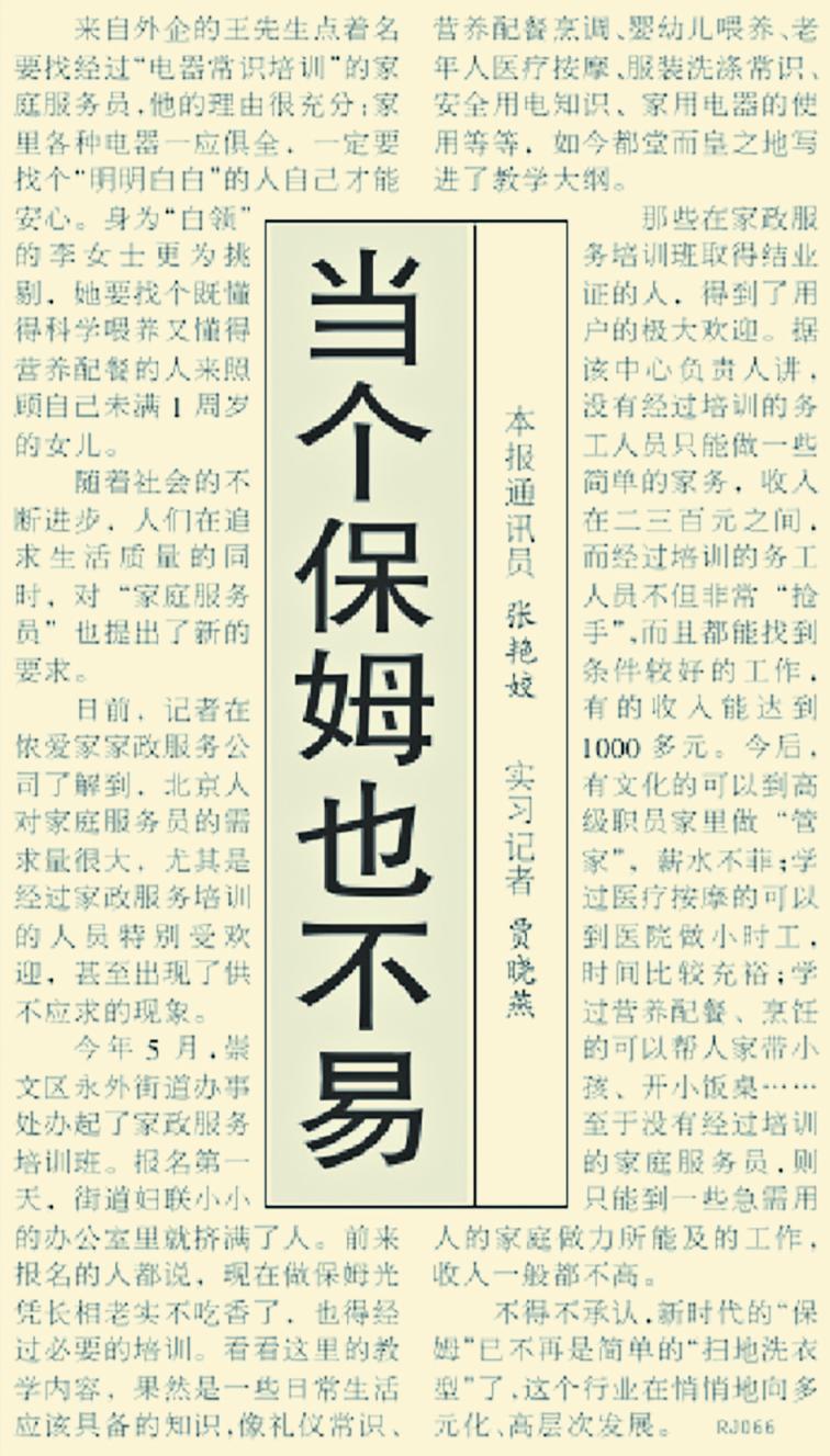 进入上世纪90年代,京城家政服务热起来,也对保姆提出了更高的专业要求。