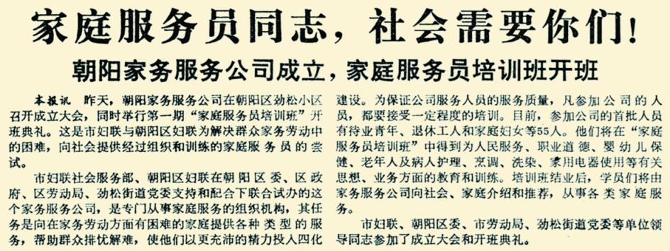 1983年,由市妇联、朝阳区妇联主办的朝阳家务服务公司成立,这是本市第一个为居民提供各种形式家庭服务的群众性服务机构,首批招收了55名家庭服务员,他们中有待业青年、退休工人,也有家庭妇女等。为保证服务质量,他们上岗前都学习了简单的婴幼儿保健、老年人及病人护理等知识。(1983年12月22日《北京日报》1版,《家庭服务员同志,社会需要你们!》)