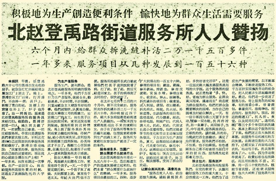 后来,北京的街道开始成立服务所,配有服务员,如果谁家有雇保姆的需求,也能帮着解决。住在大乘巷三号的程女士是京棉二厂的女工,她在医院生完孩子回家,没雇到保姆。服务所了解这个情况后,马上派服务员到她家去做临时保姆,侍候产妇和孩子,一家人特别感激。(1960年3月6日《北京日报》1版,《北赵登禹路街道服务所人人赞扬》)