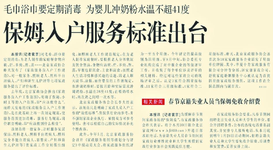 2010年,北京家政协会发布了《家政服务员入户工作规范》,对一般家务、照顾老人、照料半自理病人、产妇和新生儿护理等7项家政服务提出了评价标准。比如,在冲调奶粉时,要按月龄和实际需求冲调奶粉,水温在38至41摄氏度;在喂奶喂水时,两次奶之间喂一次水等。(2010年12月24日《北京日报》6版,《保姆入户服务标准出台》)