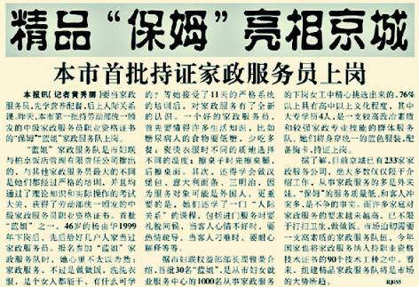 那时候,本市劳动部门发出通知,对家政服务人员进行职业技能培训和就业资格认定作出规定。1995年,北下关街道三八服务公司对来自四川、河南、安徽等地的保姆进行了专业培训,内容涉及法律知识、卫生与安全常识、家庭操作技能、社交礼仪、品德教育、儿童心理学等多个方面。结果,33人通过结业考试,成为本市首批持证上岗的保姆。(1995年11月29日《北京日报》1版,《小保姆“持证上岗”》)