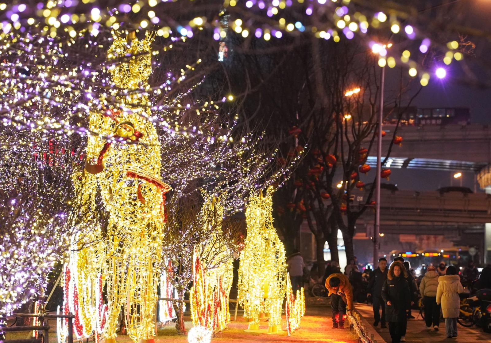 错落有致的光影装置覆盖CBD核心商圈,形成连片成景的夜间视觉盛宴。市民漫步其中,既能感受商务区的摩登璀璨,也能在马年主题光影中体悟新春民俗内涵,浓厚年味随着光影流转弥漫城区。