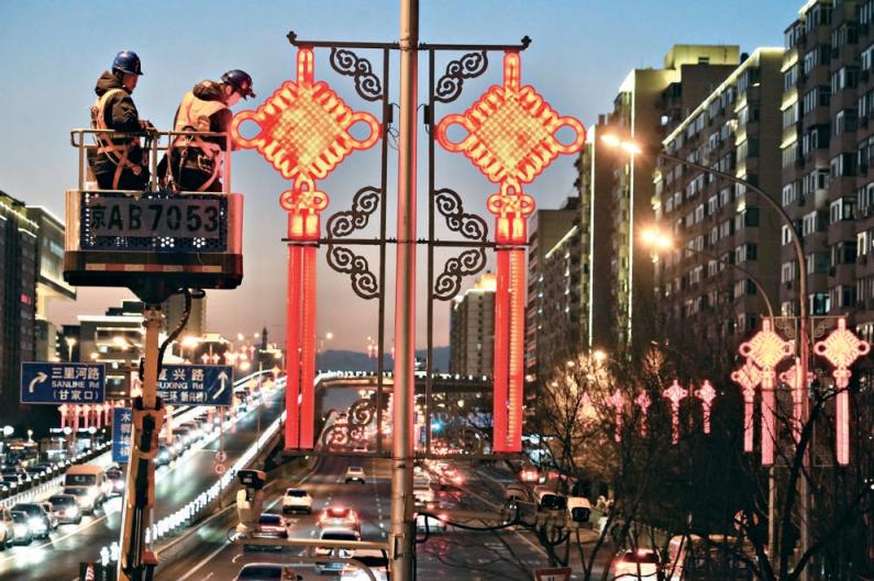 17时50分许,复外大街木樨地路段红色的中国结亮起了灯。黄建和同事驾驶着一辆高空作业车出发。黄建是国网北京电力城市照明管理中心运维检修二班的班长,他们负责二环内2.6万余盏路灯的运行维护工作,而每到春节前后,他们还额外增加了一项重要任务,就是要确保长安街两旁的大红灯笼和中国结始终正常工作,为京城增添浓浓年味。
