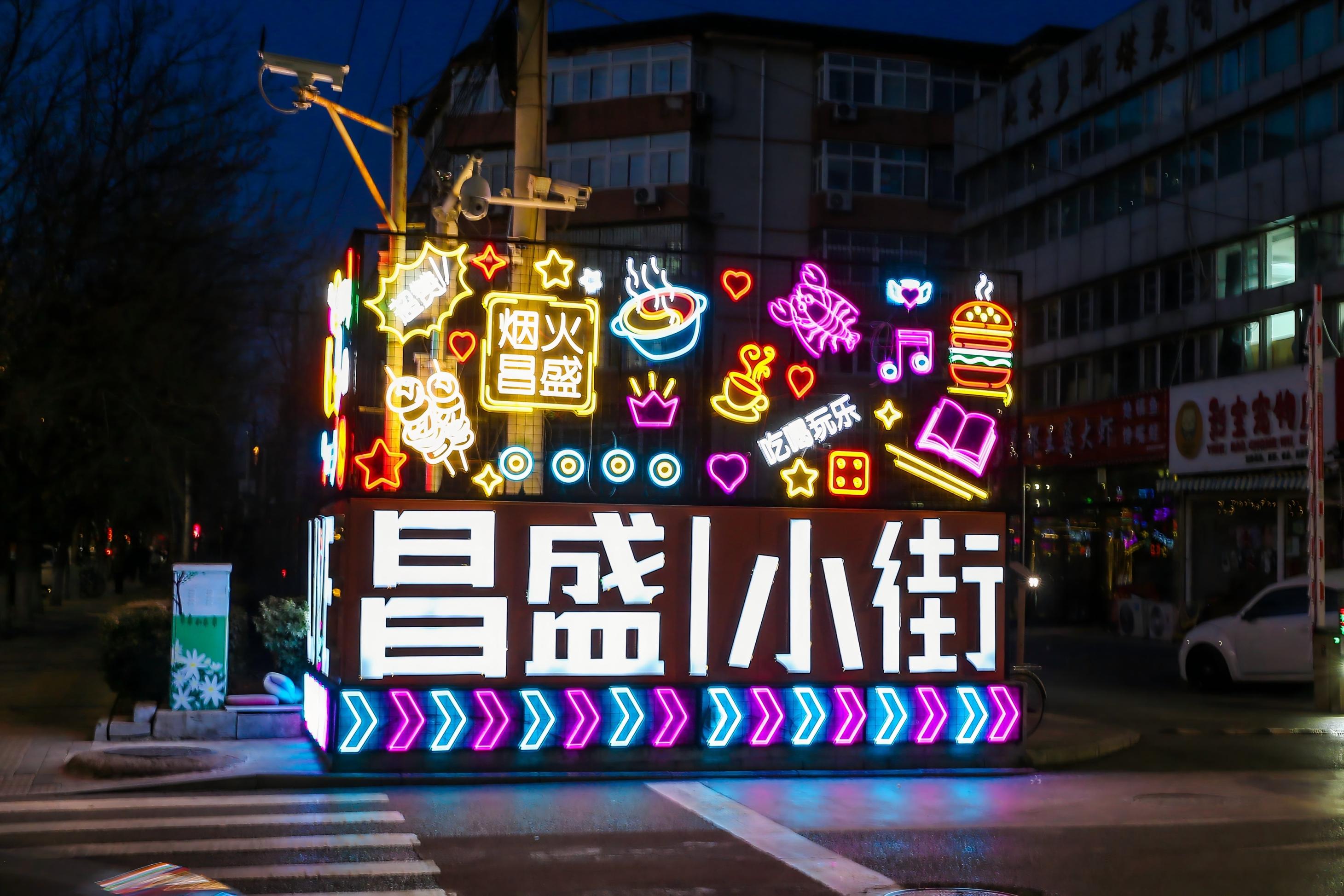 本次大集并非日落即散,自大集开市起至马年元宵佳节,昌盛小街围绕“灯火映昌盛 烟火暖马年”主题还实施了新春亮化工程,点亮小街“深夜食堂”的新春氛围。小街西入口缤纷的霓虹灯光衬托出“昌盛小街”的时尚范儿,介山书店周边则用低饱和度暖光勾勒街巷肌理,门前的国风古诗词挂灯氛围感拉满。