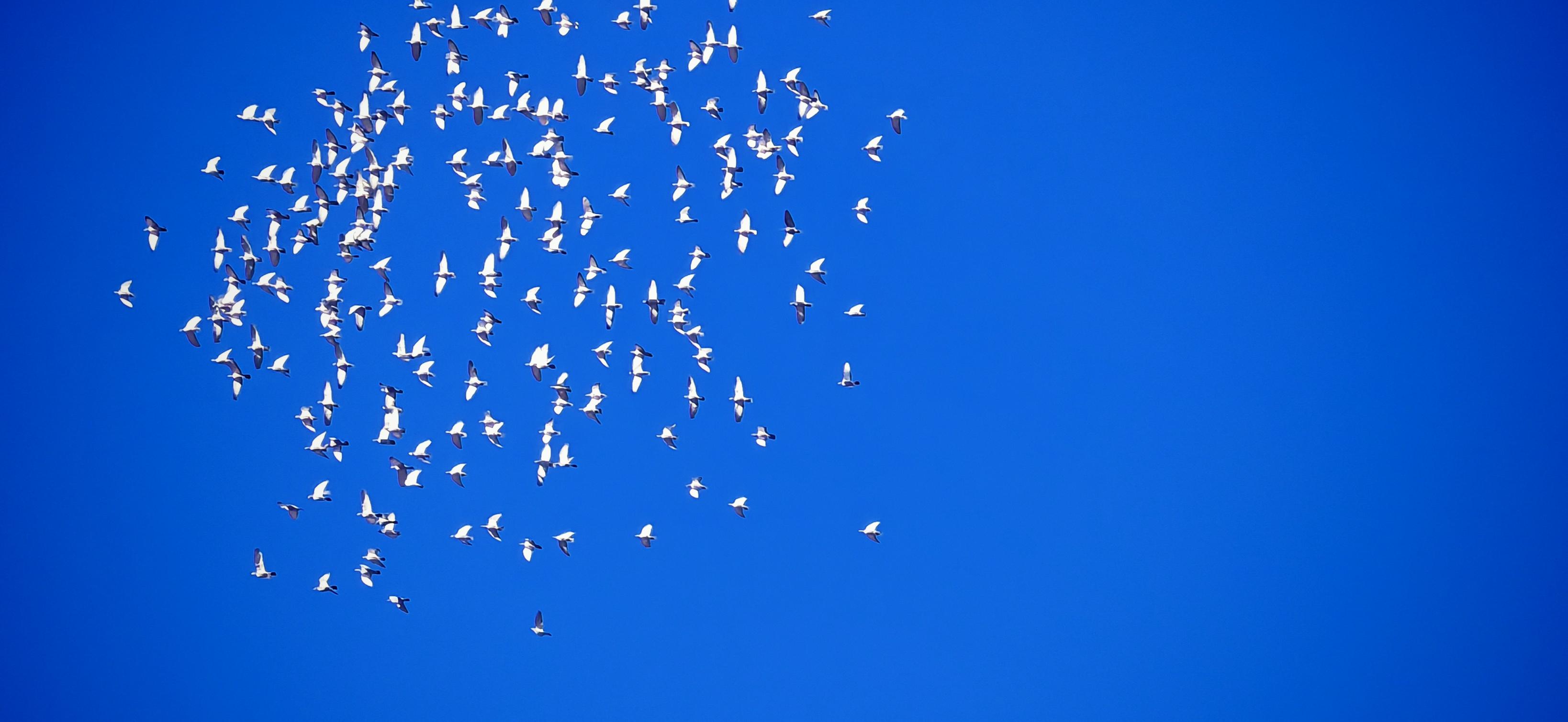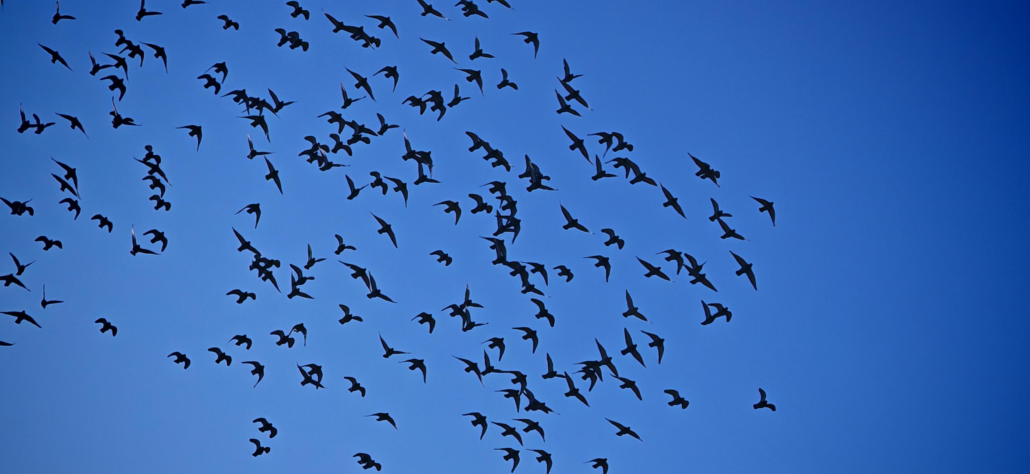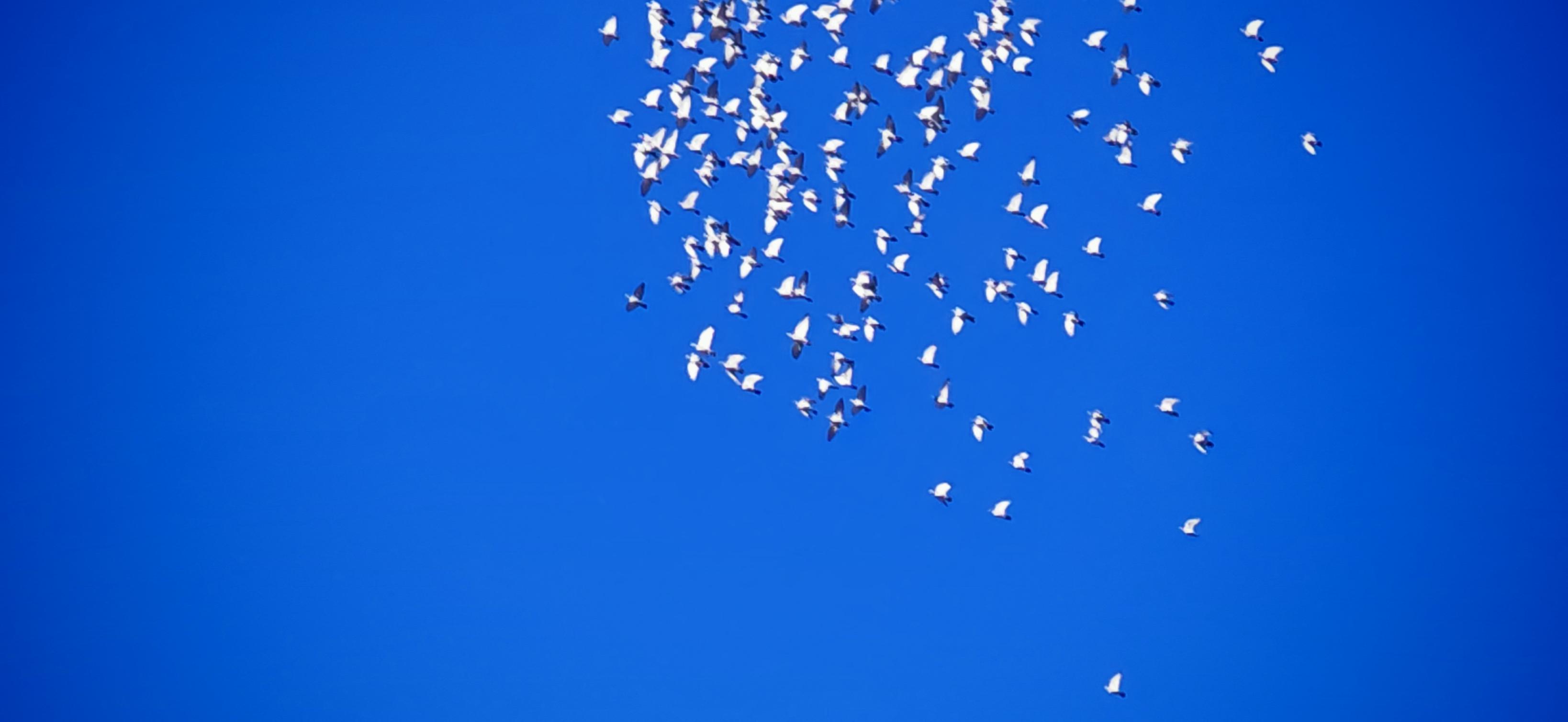 2月7日,一群飞鸟在王府井大街“北京蓝”天空盘旋飞翔,为王府井大街上来来往往的游客增添了欢乐的气氛。