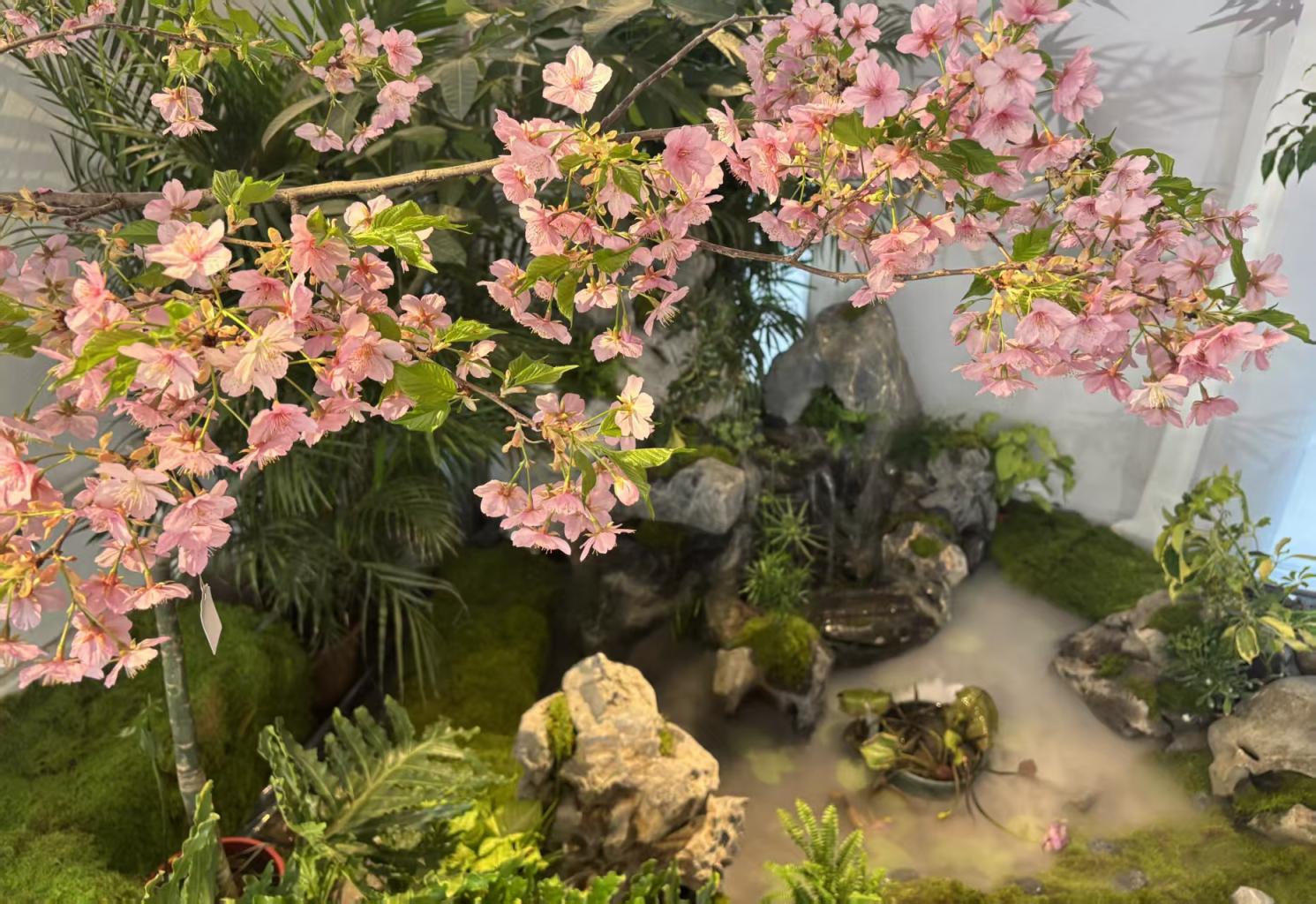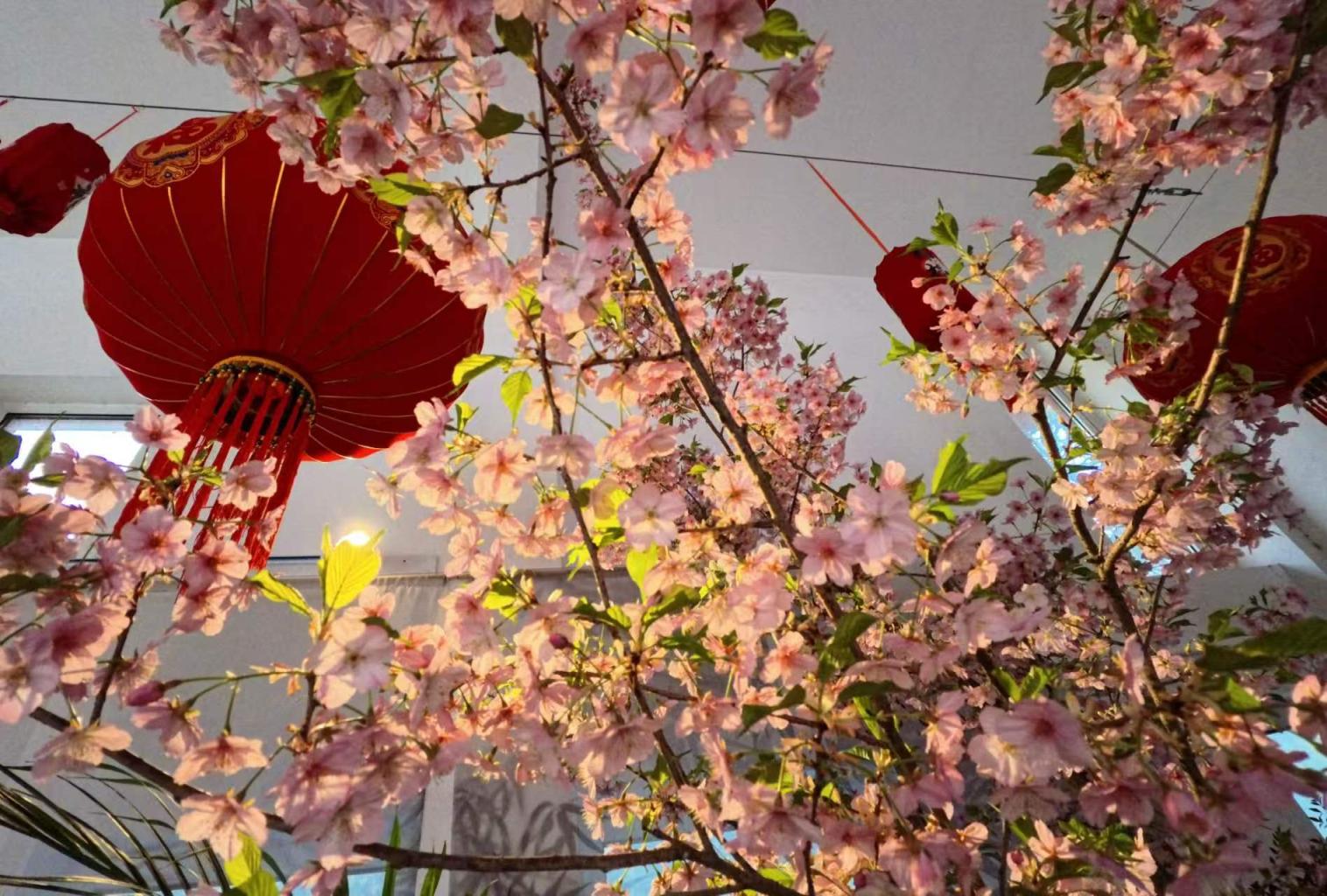步入小樱驿站,仿佛一脚踏入了提前而至的春天。在大红灯笼、山石流水、蝴蝶兰花瀑的映衬下,粉樱娇艳,春意袭人。