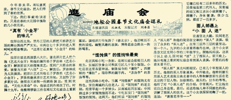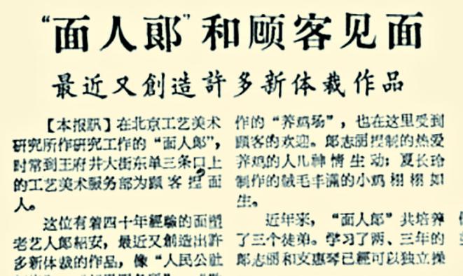 1985年,地坛春节文化庙会开幕,这是改革开放后,北京为恢复民间传统活动、丰富群众文化生活首次举办的大型文化庙会。当时,面人被纳入民俗手工艺品区,主办方邀请了多流派面塑艺人驻场。据本报1985年2月19日1版《逛庙会》报道,当天,“面人郎”郎绍安和他的徒弟张宝琳在庙会上进行捏面人表演时,吸引了众多“面人迷”。其中一个小“粉丝”只有八九岁,她是专程为看捏面人表演而来的,郎绍安不仅送给她各色的面团,还现场“收徒”,为其讲解捏面人的技术。