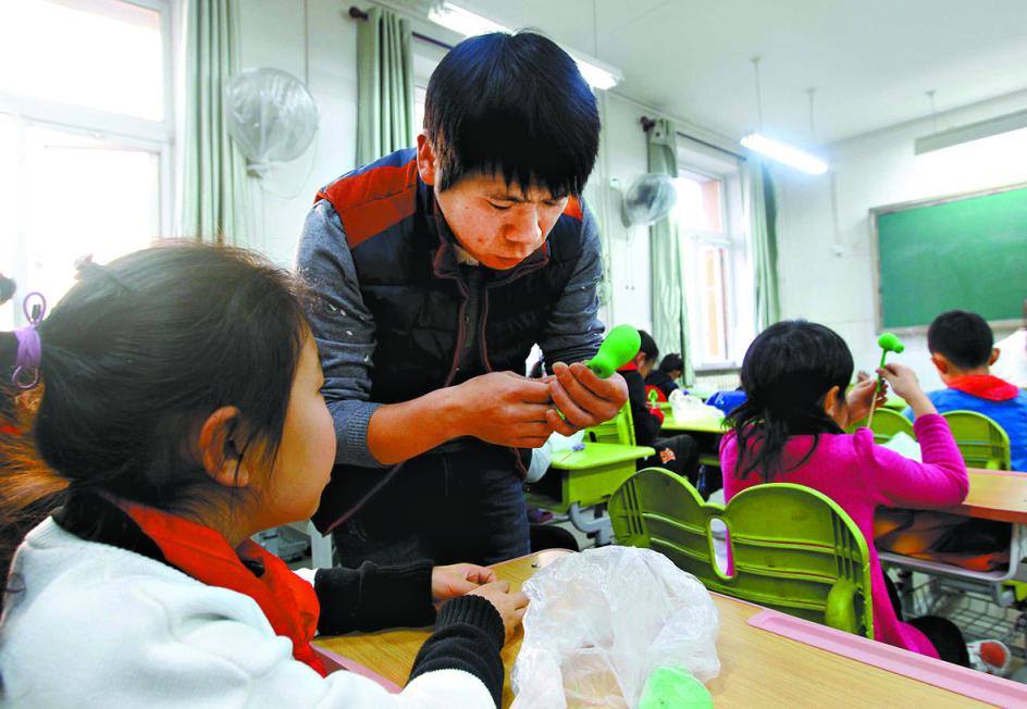 2017年,在石景山区银河小学的美术教室里,特聘教师李晓军为同学们上捏面人手工课。 吴镝摄