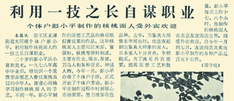 1981年,“面人曹”的第三代传承人彭小平利用制作核桃面人的一技之长自谋职业,成为北京首批个体户之一,也是北京第一个下海经商的传统手艺人。当时,北京工艺美术商店、友谊商店等率先恢复民间工艺专柜,引入面塑售卖。彭小平的作品入驻友谊商店后,他捏的面人摆在小玻璃罩内或核桃壳里非常抢眼,许多来北京旅游的港澳同胞和外国游客都争相选购。那时,他捏一个月的面人摆上柜台后,两三天就售罄。有一次,面人刚上架两个小时就被一个国外旅行团包圆了。仅1981年上半年,友谊商店就卖出彭小平制作的各种面人500多件。(1981年7月28日《北京晚报》1版,《利用一技之长自谋职业》)
