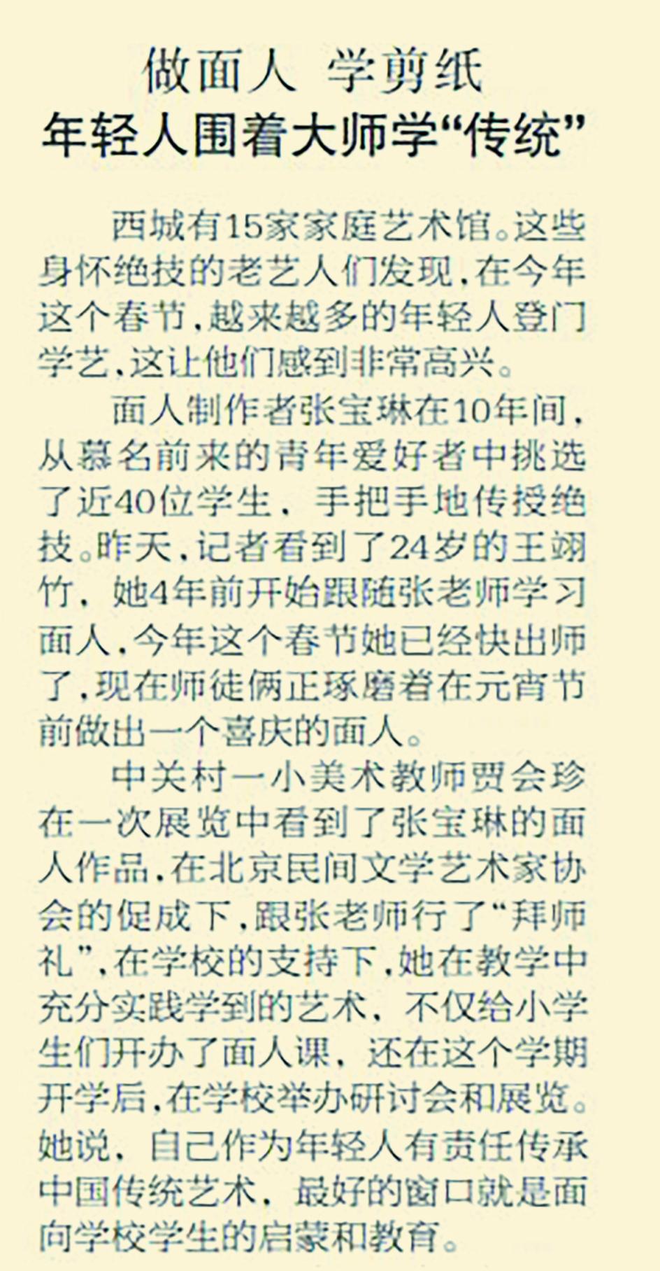 为了让这门老手艺延续,2004年,西城区首批“家庭艺术馆”挂牌,位于羊肉胡同的张宝琳面人家庭艺术馆便是其中之一。免费开放后,越来越多的年轻人登门学艺。中关村一小美术教师贾会珍在学校的支持下,不仅给学生们开办了面人课,还在学校举办了研讨会和展览。(2006年2月8日《北京晚报》2版,《年轻人围着大师学“传统”》)