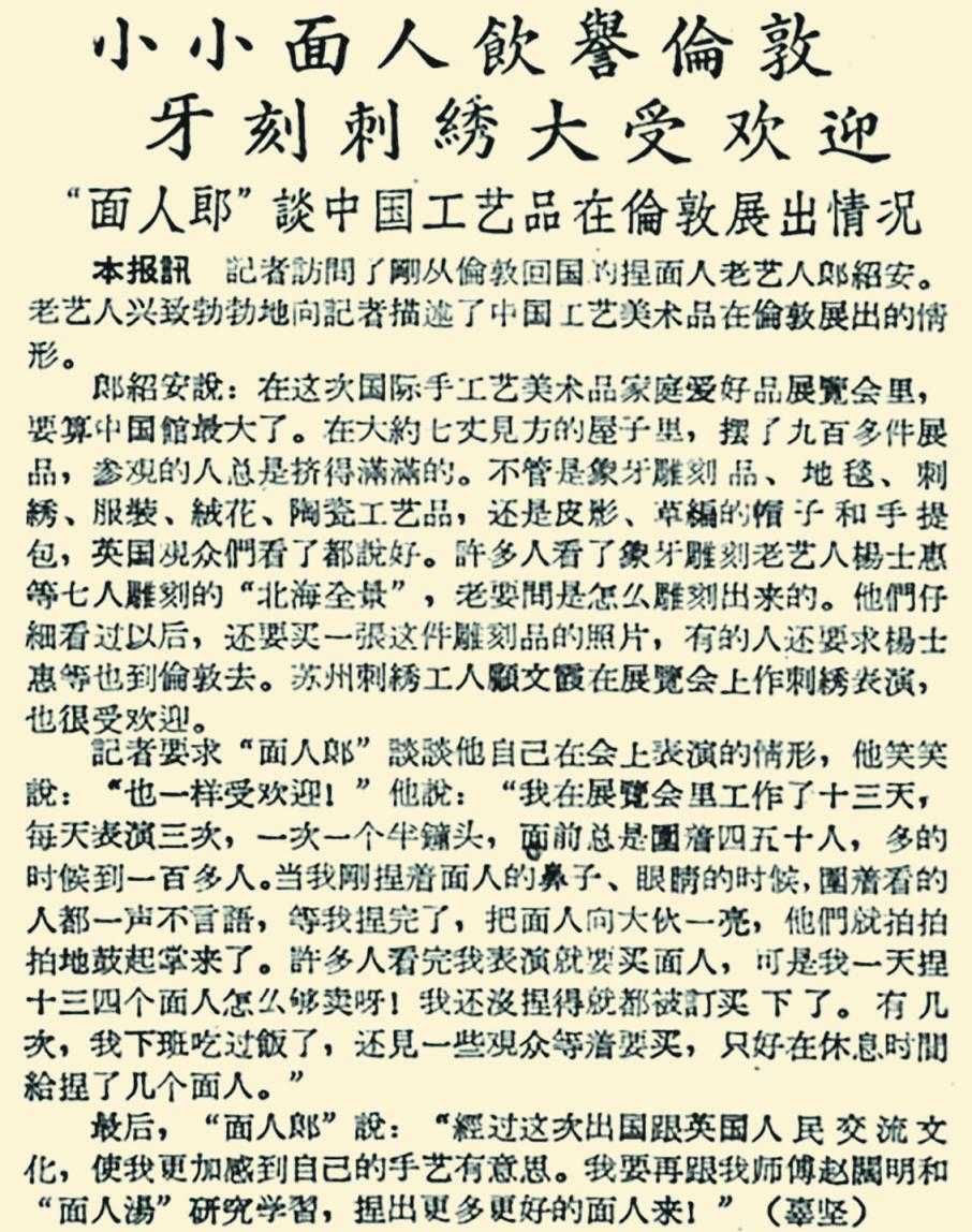 更让人意想不到的是,捏面人这类传统民间技艺还登上了国际舞台。1956年8月,郎绍安应邀赴英国伦敦参加第四届国际手工艺品展览会,这是我国手工艺品第一次在英国大规模展出。在10多天里,郎绍安每天表演捏面人时展台前总被挤得水泄不通,观众们兴致勃勃地盯着那些彩色面团在他的指尖上变成栩栩如生的京剧角色、童话人物。(1956年9月8日《北京日报》4版,《参观者看了赞不绝口》)刚看到郎绍安捏出面人的鼻子、眼睛,围观者中就有人大喊“我要预订!”当时,一个普通面人售价10先令,精致些的仕女、卫兵要1英镑,这对普通英国家庭来说并不便宜,但每天仍供不应求。(1956年10月18日《北京日报》2版,《小小面人饮誉伦敦 牙刻刺绣大受欢迎》)由于每次表演都很火爆,为了使站在远处的观众看到,展会还特意在郎绍安的工作台顶上装了两面大镜子。伦敦电视公司为此还作了电视广播,英国影片公司拍了纪录片,惊叹其“指尖绝活”。(1957年1月16日《北京日报》2版,《我出了一趟国!》)