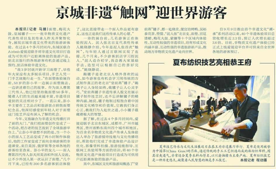 文旅融合也为北京面塑发展打开了新的大门。2019年,非物质文化遗产体验正式上线爱彼迎平台,并接受世界各地的游客预订。当把捏面人这个老技艺放到全球旅游平台后,彭小平工作室很快变成了面向全球游客的非遗课堂,不少外国人第一次认识了面塑,上百名游客到店体验。(2019年10月30日《北京日报》7版,《京城非遗“触网”迎世界游客》)