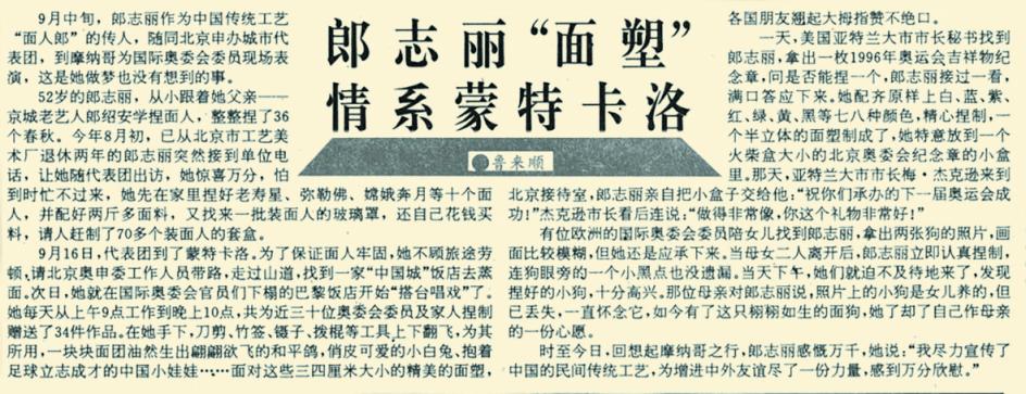 1993年,“面人郎”第二代传承人郎志丽受邀随北京申办2000年奥运会代表团赴摩纳哥蒙特卡洛助力,她以和平鸽、兔子为主题创作出各种精美面塑,作为特色礼品赠予国际友人。期间,美国亚特兰大市市长秘书慕名而来,恳请她制作一枚1996年奥运会吉祥物纪念章面塑。郎志丽精心捏制了一个半立体作品,市长梅·杰克逊收到后赞不绝口。(1993年11月7日《北京日报》6版,《郎志丽“面塑”情系蒙特卡洛》)