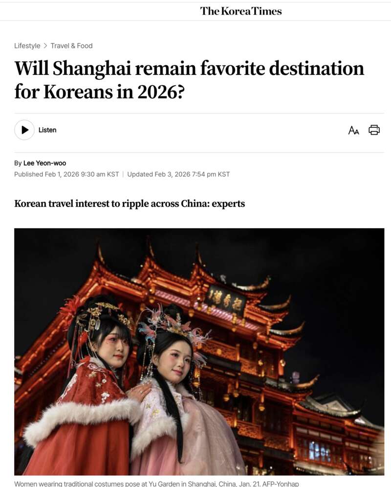 多位韩国游客及旅游业从业者在接受《韩国时报》采访时表示,对初次前往中国的游客而言,上海是较为便捷的入境首选地。这座城市能为人们提供更好的国际化氛围和全球联通体验。