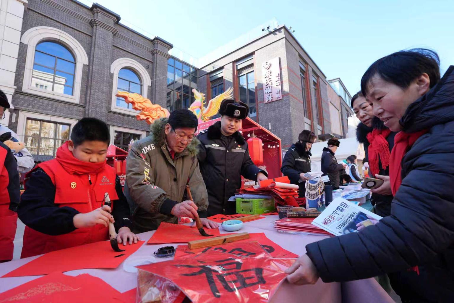 椿树派出所请来了书法大师和天宁寺派出所的小志愿者现场“写福送福”,不少游客也围在展台边挥毫泼墨一展身手,自己写个福字带回家。虽说是反诈宣传,但摊位上一张张大红的福字和写着“反诈是门必修课”的红色条幅,完全融入了年货大集的热烈氛围。
