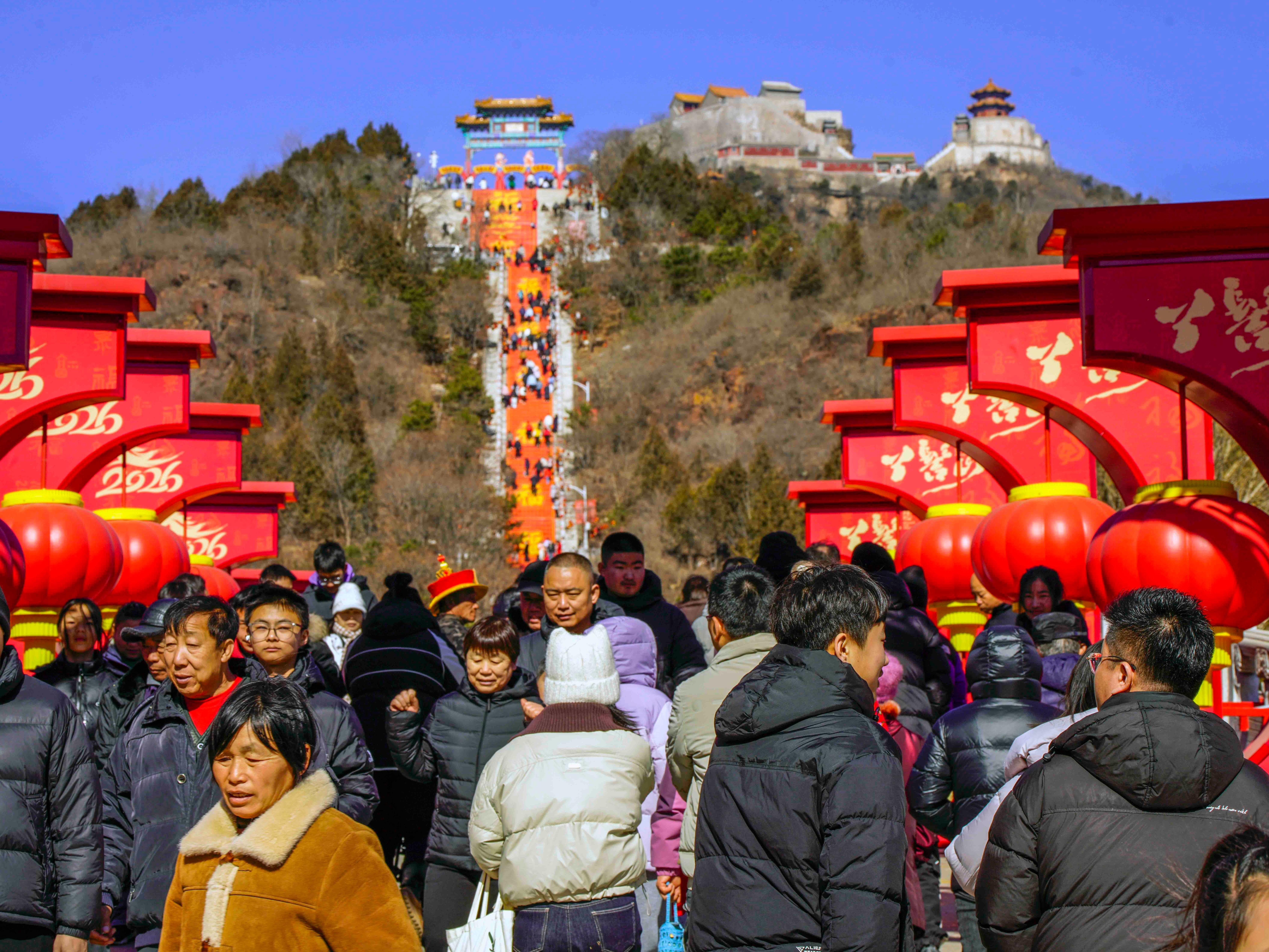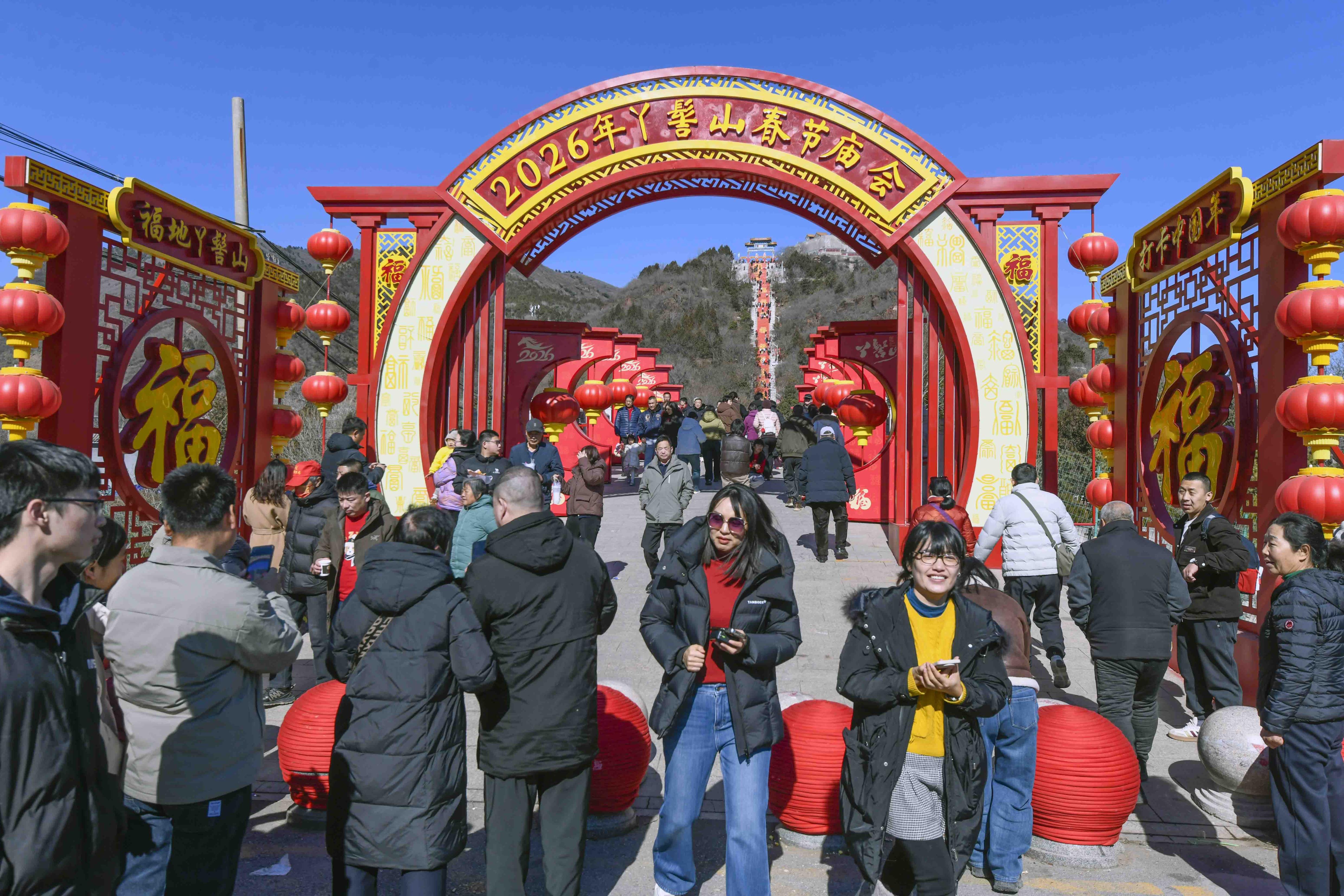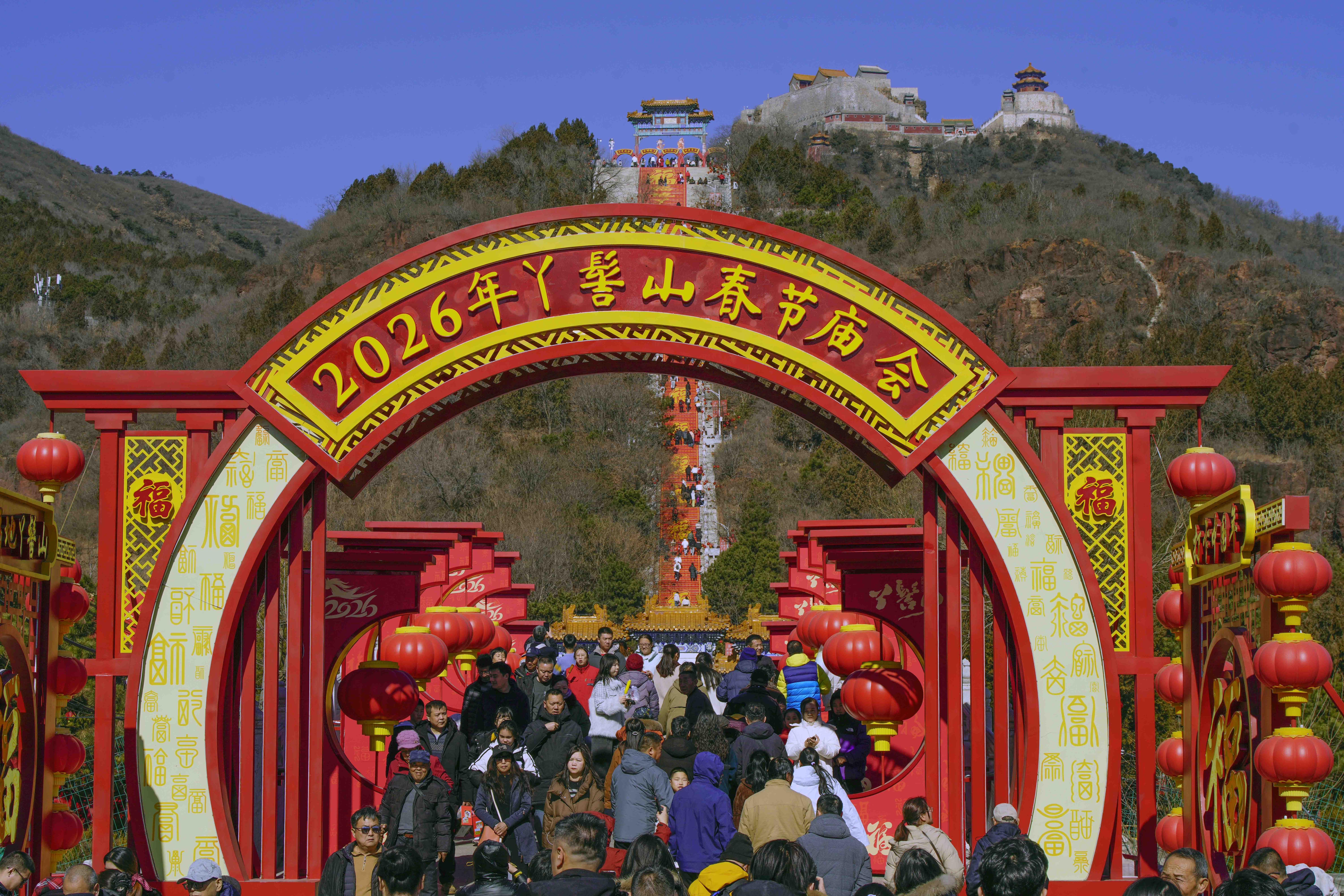 正月,北京市平谷区丫髻山景区举办的春节庙会人山人海,热热闹闹,一派喜气洋洋贺新春的景象。