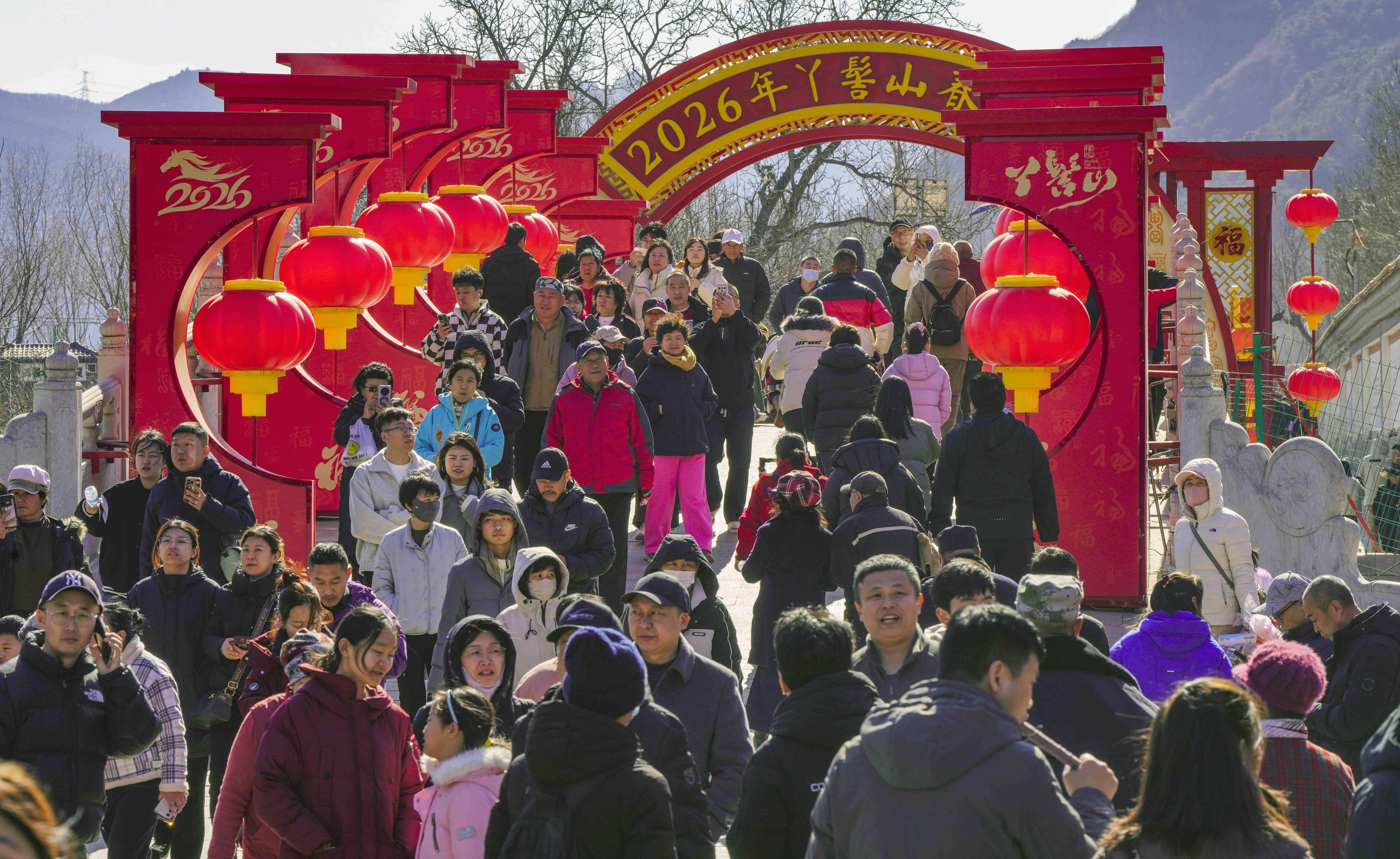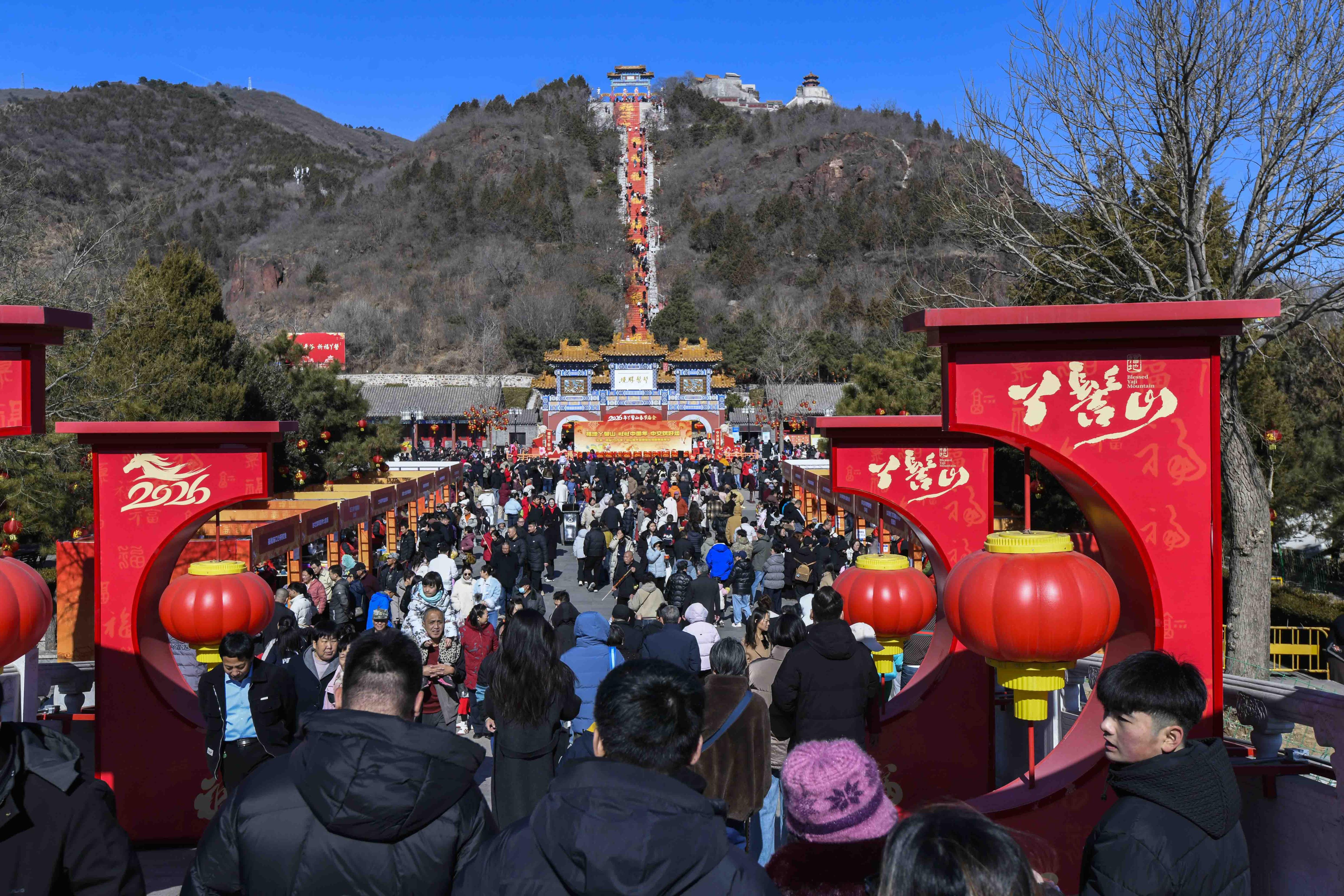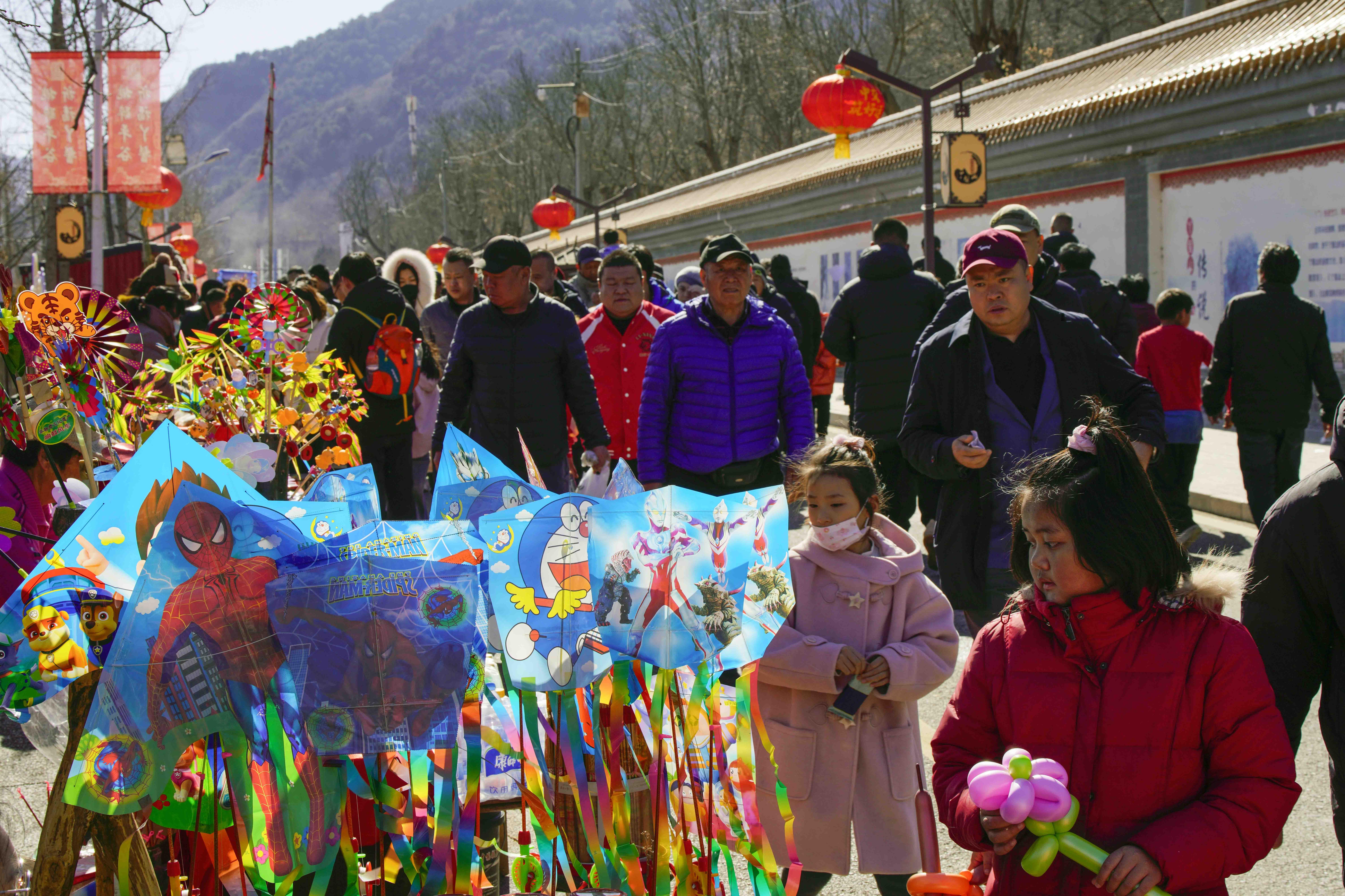 正月,北京市平谷区丫髻山景区举办的春节庙会人山人海,热热闹闹,一派喜气洋洋贺新春的景象。