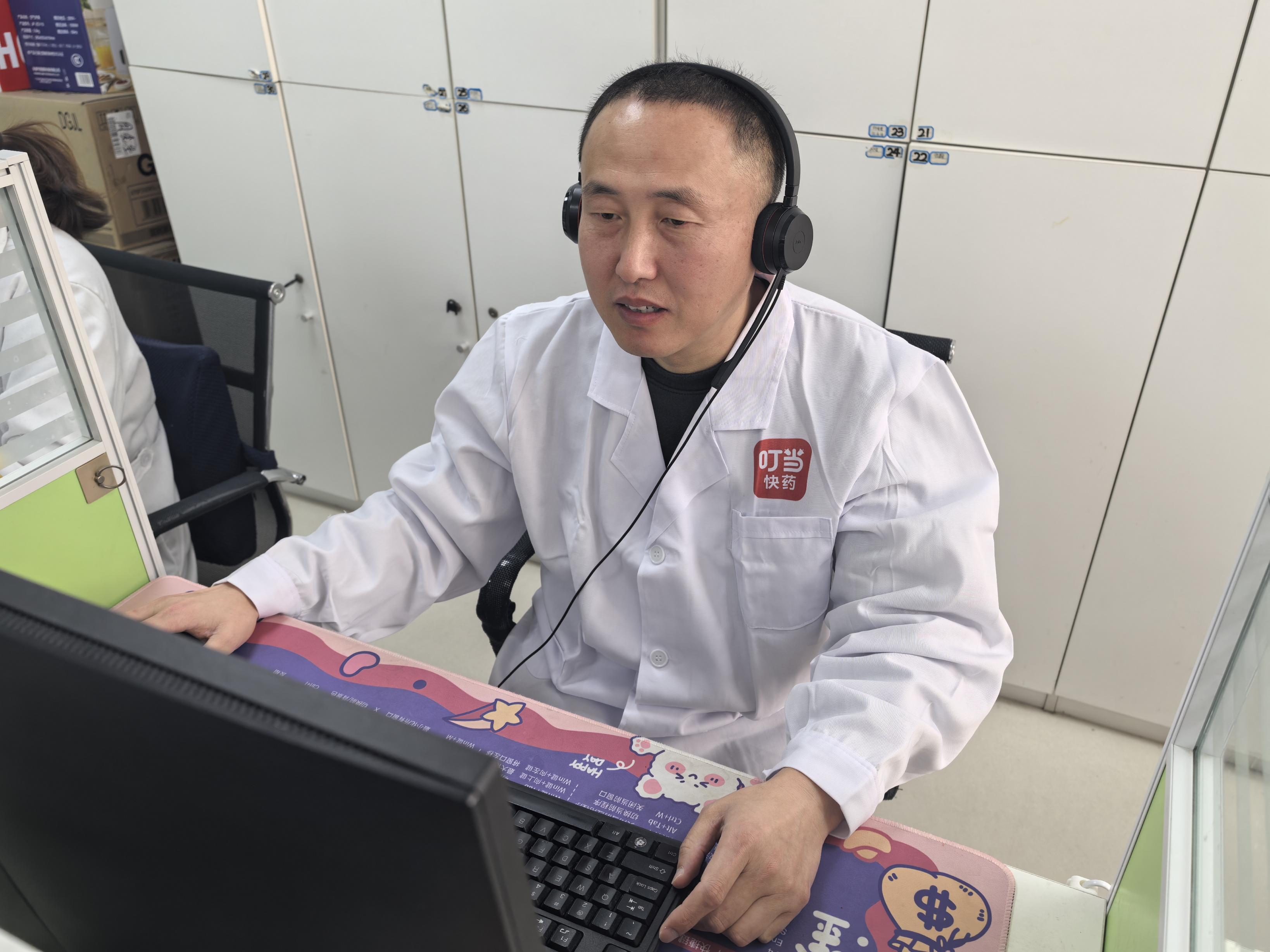 上午9时,杨文忠准时坐在了叮当快药药师服务中心的工位上。一上午的忙碌,从一位家长的紧急咨询开始。“三岁的孩子突然发烧了,家里有布洛芬混悬液,但不知道具体用量……”杨文忠结合患儿体重,随着手指在键盘上的敲击,很快便给出专业建议,他详细告知家长用药间隔、24小时内服用次数上限,同时提醒家长重复用药可能引起的不良反应。
