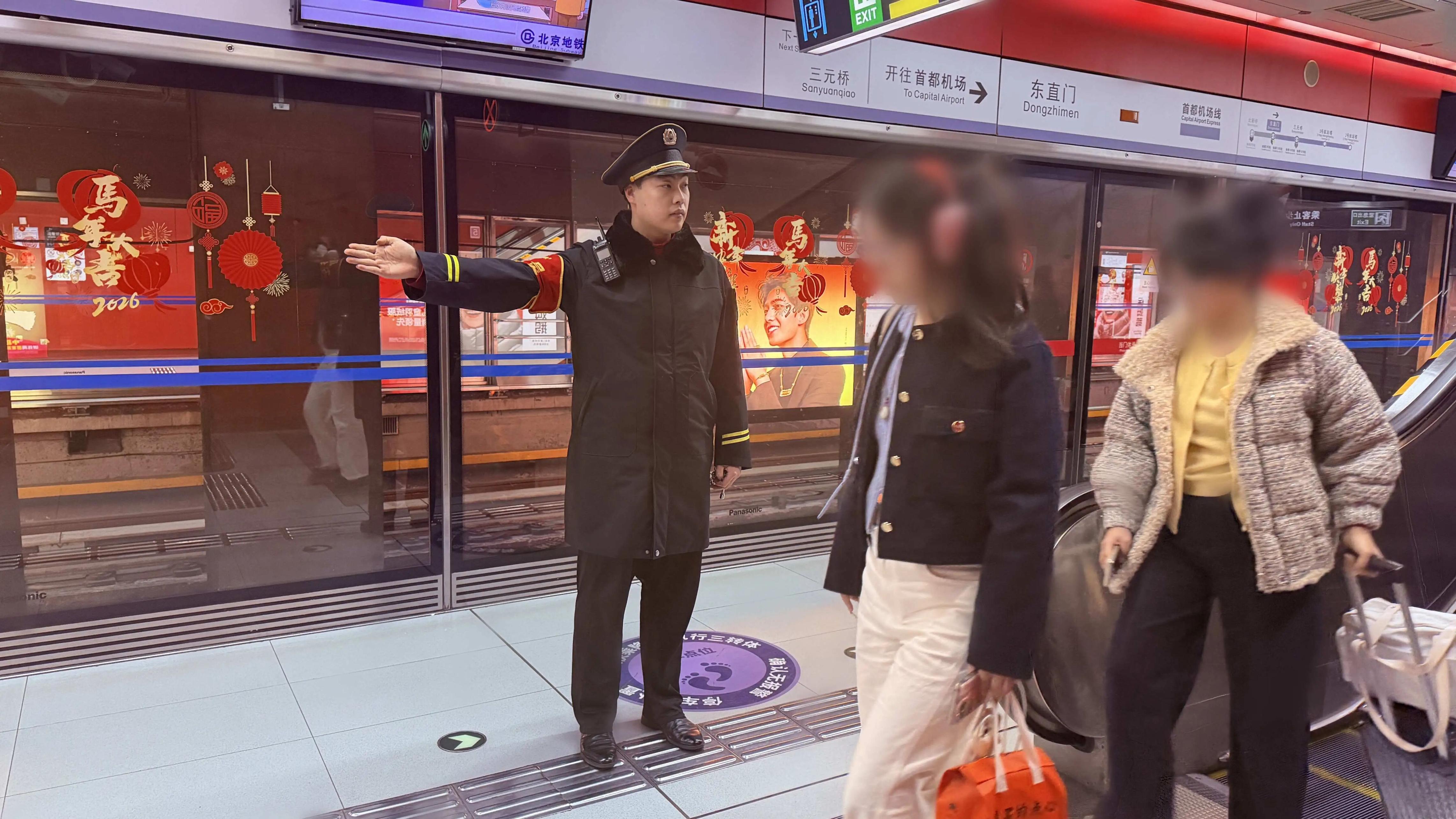 与北京站接驳的地铁2号线部分区段采取延时运营、提前开门措施。地铁北京站在进站口、换乘通道增设导流围栏和导向标识,启用全部闸机及安检通道,分区导流提升通行效率。党团员组成志愿服务队,并接收邻近车站支援人员,设置“返程服务台”,提供热水、应急药品、捆扎绳、胶带等,为老年、母婴旅客提供优先通行和行李帮扶。站内新春展板邀乘客打卡留念。