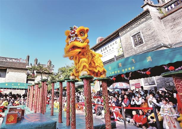 醒狮队在广东省佛山市祖庙景区进行梅花桩表演。新华社发