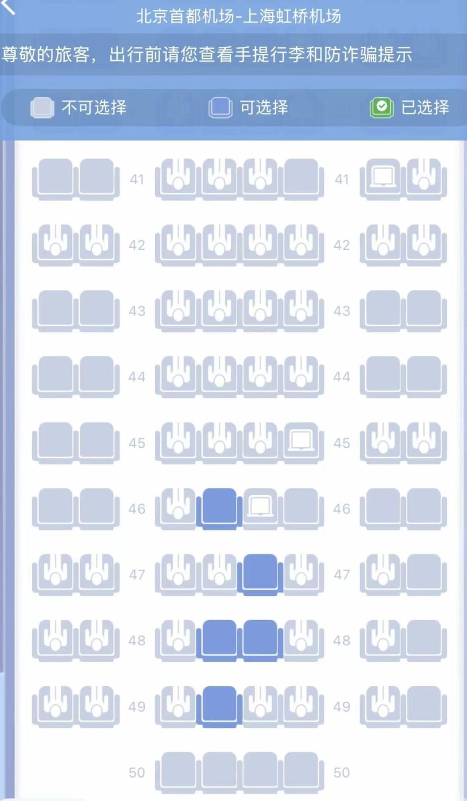 对于客服给出的“配重需要”“为残疾旅客预留”等解释,赵先生表示难以接受:“锁前面几排可以理解,一次性锁十几排,实在太夸张。”因不愿耗费时间去机场排队,他只能妥协选择了中间座位。