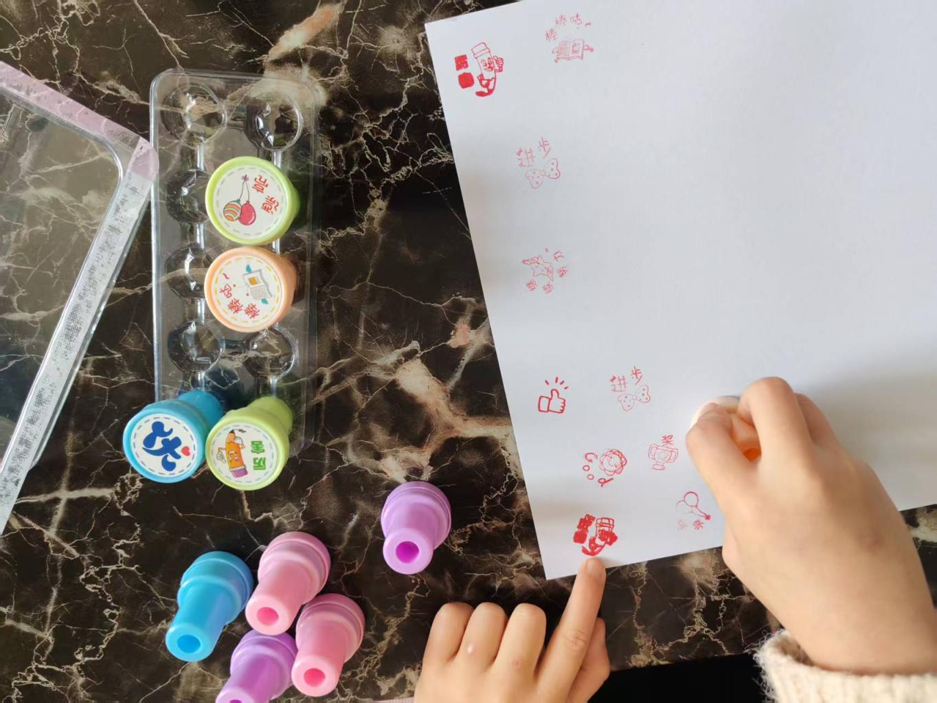 曈曈拿着小印章,在白纸上摁下红红的“进步”。小印章是她这两天最喜欢的玩具,“进步”是她最喜欢的图案。不一会儿,白纸上已经满是“进步”“厉害”“棒棒哒”“继续努力”……