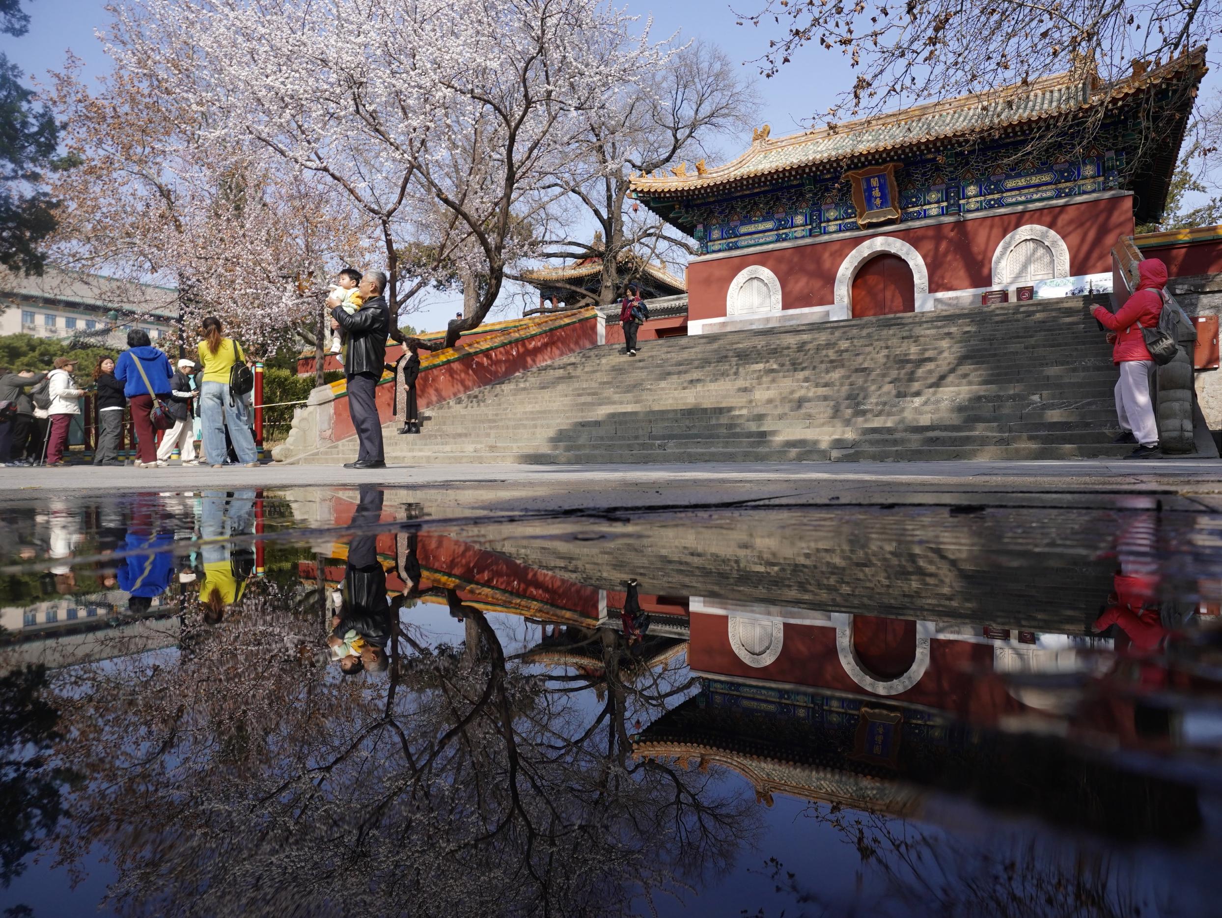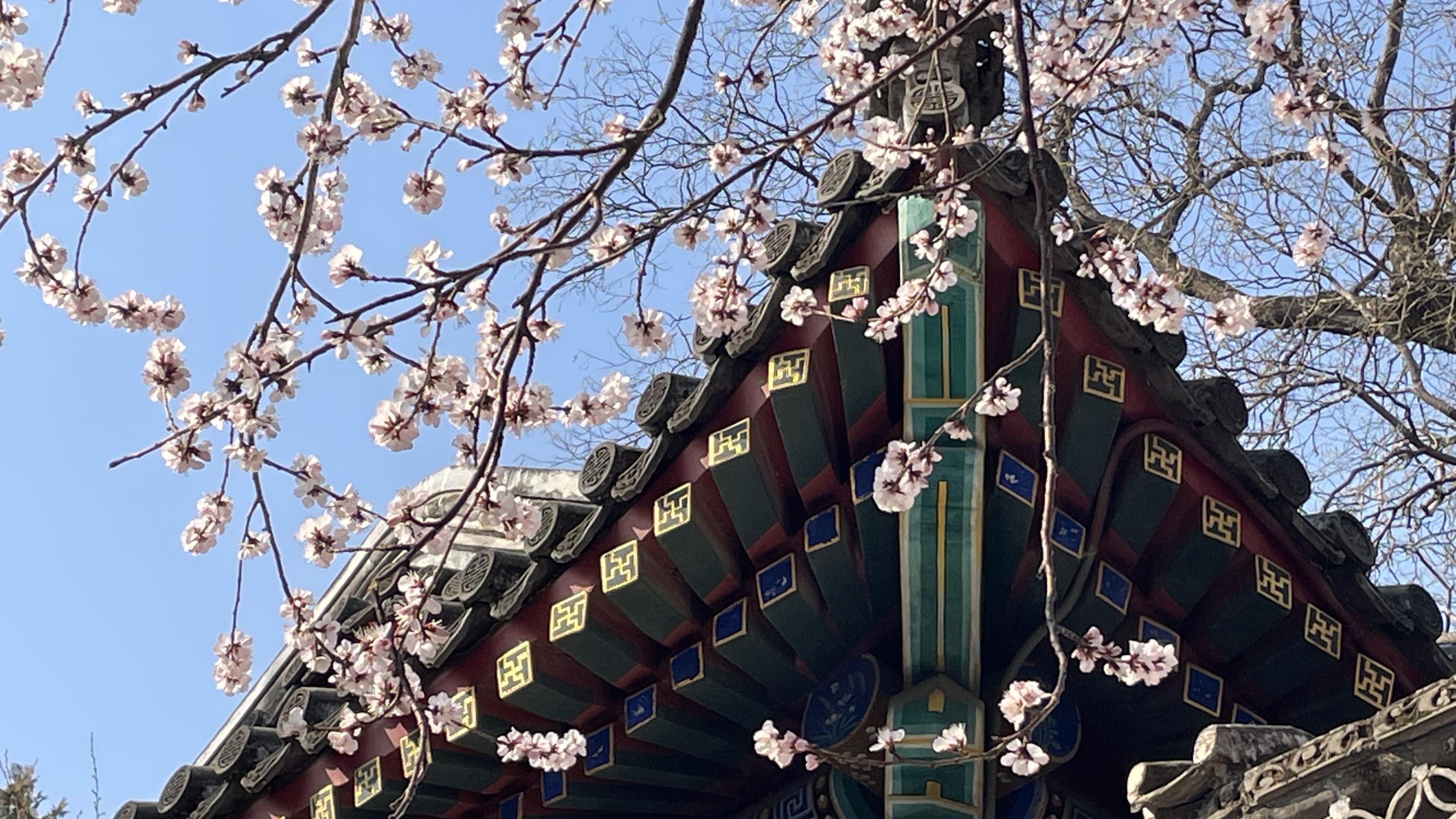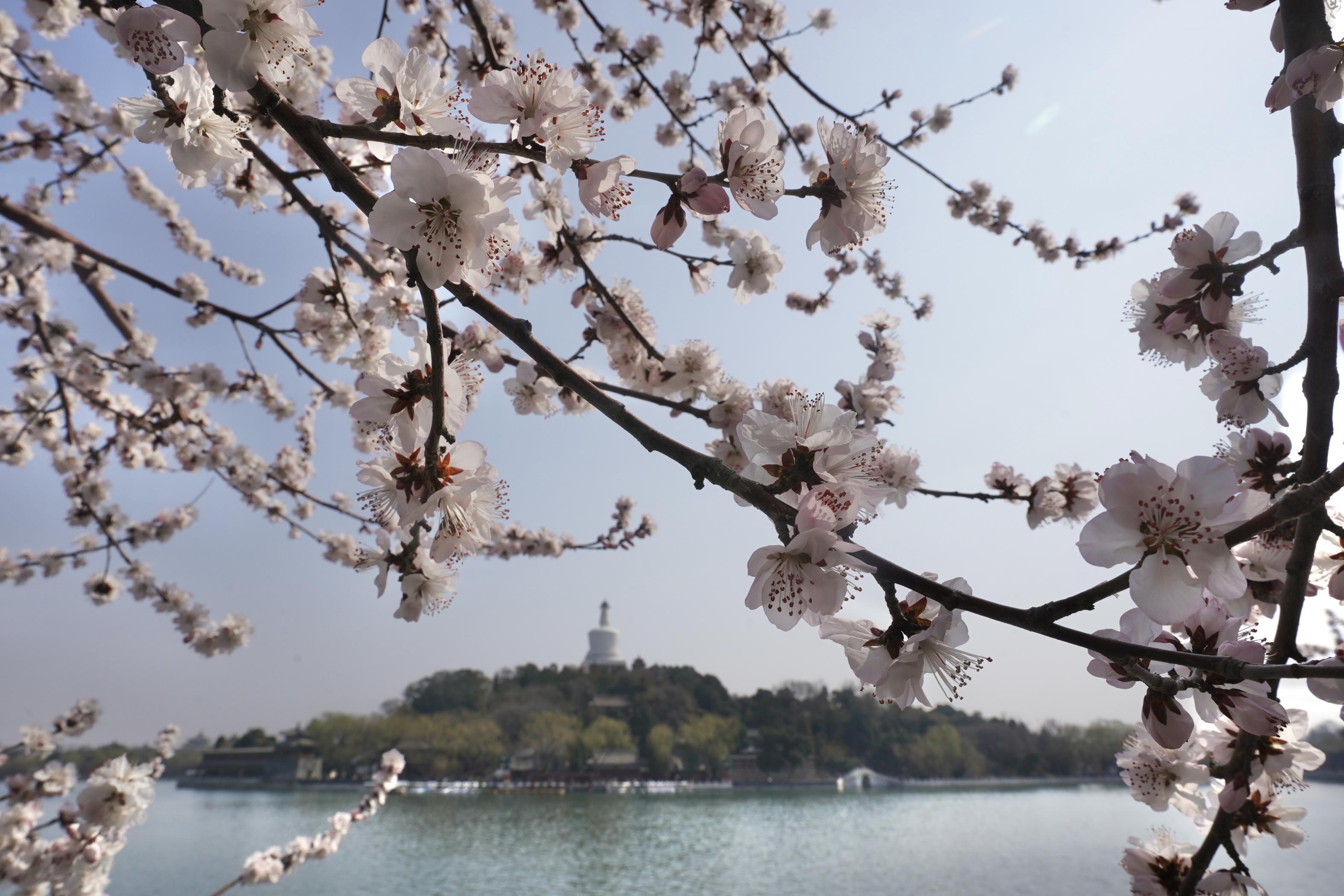 3月16日,春风轻抚,北海公园的山桃花正盛。山桃花在古建筑群中恣意地舒展着枝条,粉白的花枝在汉白玉栏杆间摇曳,与巍峨的白塔、朱红的古建相映成趣,勾勒出京城经典的“山桃映白塔”画卷。空气中弥漫着淡淡的花香,让人真切地感受到,春天已经来到这座古老的园林。