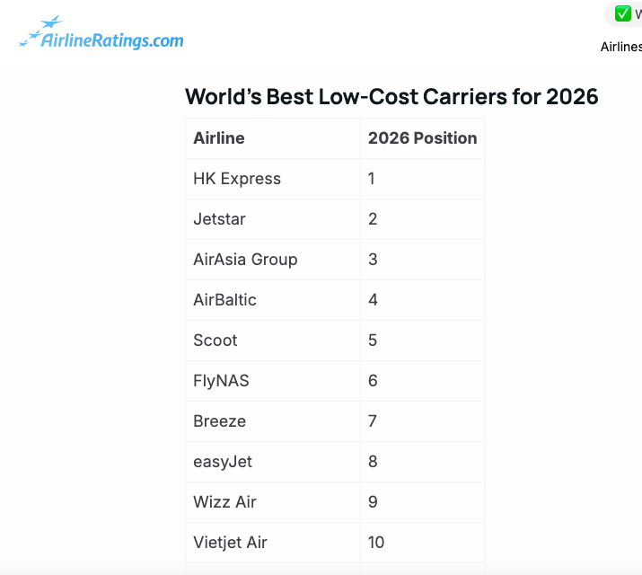 记者查询AirlineRatings官网获悉,捷星航空、亚洲航空、波罗的海航空、新加坡酷航分列榜单二到五位。