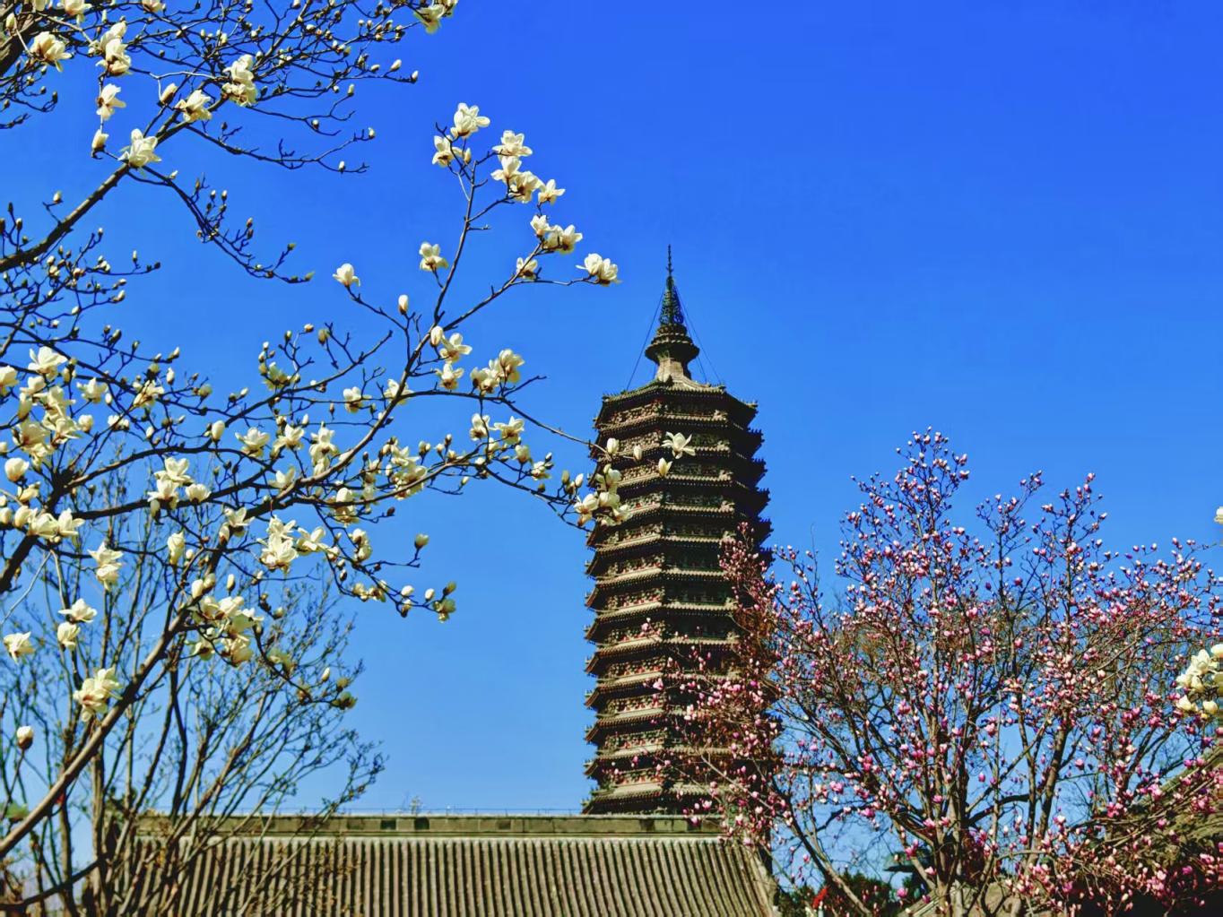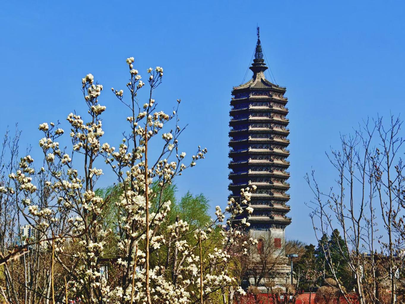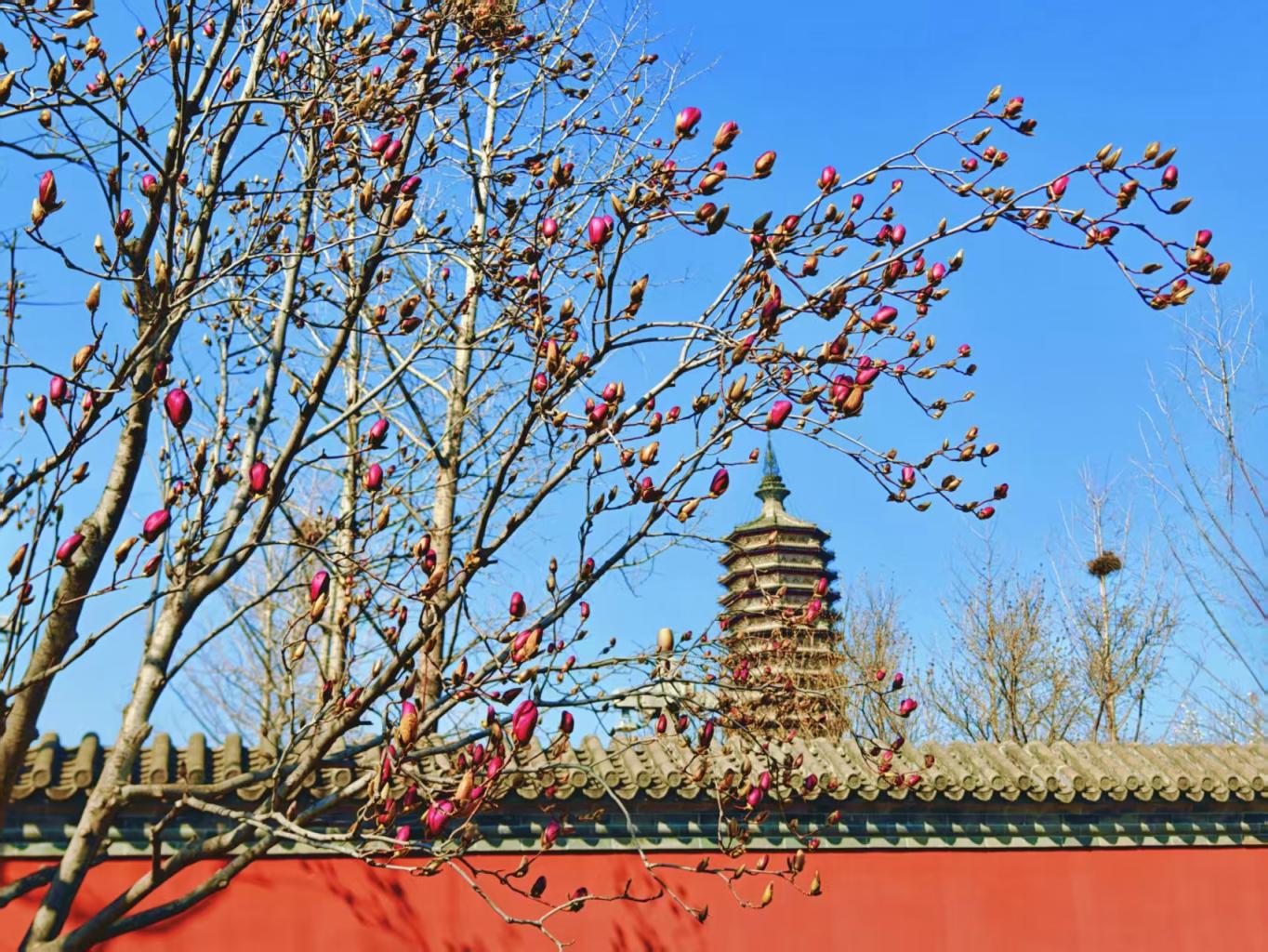 粉白花枝映着千年燃灯塔影,红墙古建与芳菲相映,