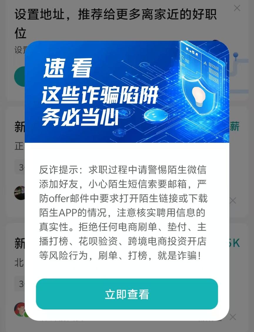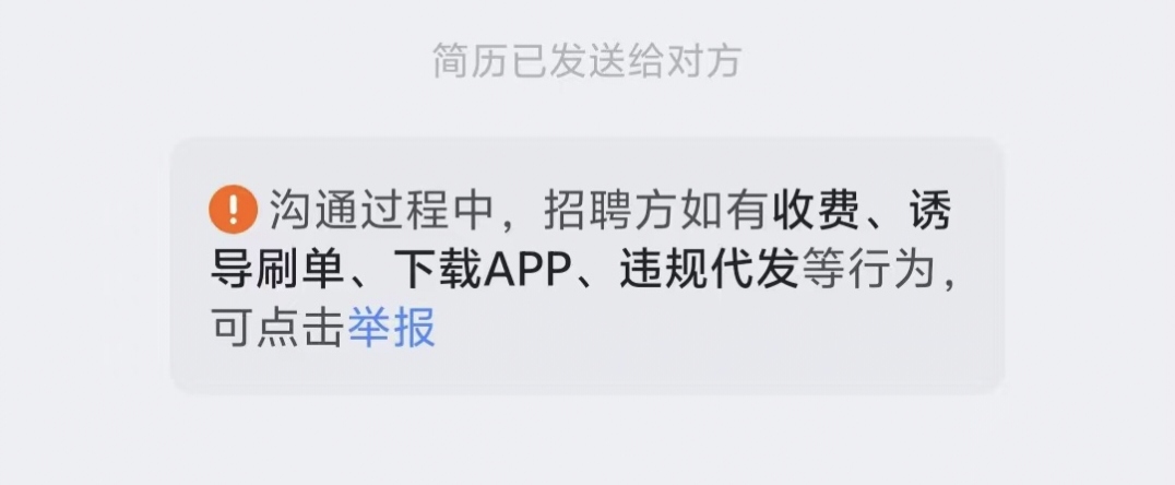 “沟通过程中,招聘方如有收费、诱导刷单、下载APP、违规代发等行为,可点击举报……”记者看到,多家招聘平台已在求职者与企业联系人聊天界面或以登录弹窗形式推送招聘类诈骗防范提示。