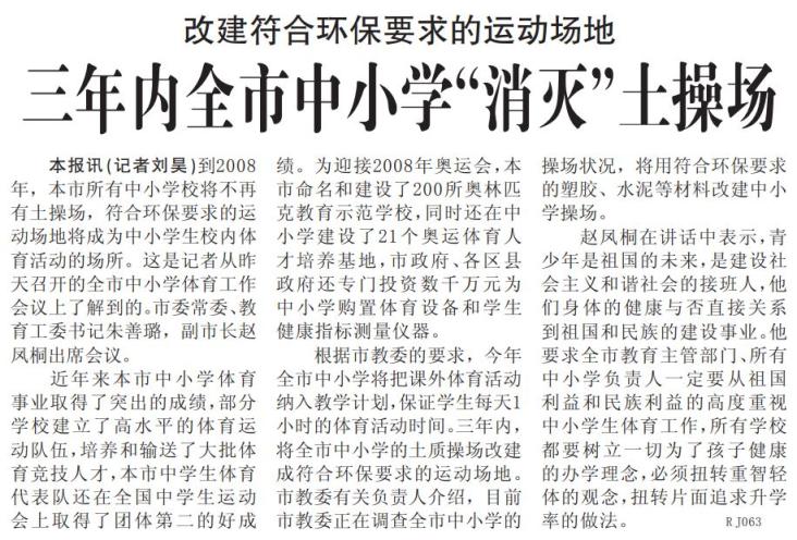 2006年,北京作出承诺:3年内将全市中小学的土操场全部改建为符合环保要求的塑胶或水泥场地,让一刮风就尘土飞扬、跑步时脚下凹凸不平的场景彻底成为历史。为迎接2008年奥运会,北京命名和建设了200所奥林匹克教育示范学校,同时在中小学建成21个奥运体育人才培养基地,还投入数千万元专项资金,为中小学购置体育设备和学生健康指标测量仪器。(2006年6月11日《北京日报》1版,《三年内全市中小学“消灭”土操场》)