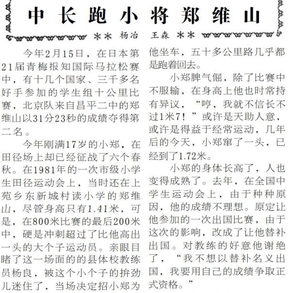 这一政策让校园运动会的意义不再只是课余文体活动,更是激励学生全面发展的加分项。从市小学生田径运动会上脱颖而出的郑维山,经过6年刻苦训练,从昌平二中的校级赛场一路跑进了国际赛场,在1987年举办的国际马拉松赛上获得学生组亚军。(1987年3月13日《北京日报》4版,《中长跑小将郑维山》)