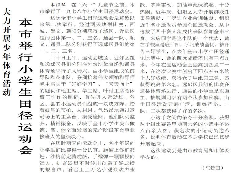 1978年5月举办的全市小学生田径运动会,成为北京校园体育复苏的标志性赛事,共有600余人次跻身各单项比赛前六名。赛场上,朝阳区“三好”学生朱应的进步格外亮眼:她1977年的跳远成绩仅3.9米,经过一年系统训练,在本届赛事中跳出4.55米,夺得女子甲组跳远第三名,同时位列跳高比赛第六名。(1978年5月24日《北京日报》2版,《本市举行小学生田径运动会》)