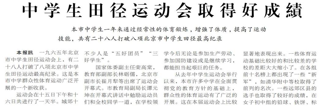 1965年,在北京市中学生田径运动会上,共有28名运动员打破8项市中学生纪录,他们将“准备劳动与卫国”的誓言化作了赛场荣光。(1965年5月17日《北京日报》2版,《中学生田径运动会取得好成绩》)