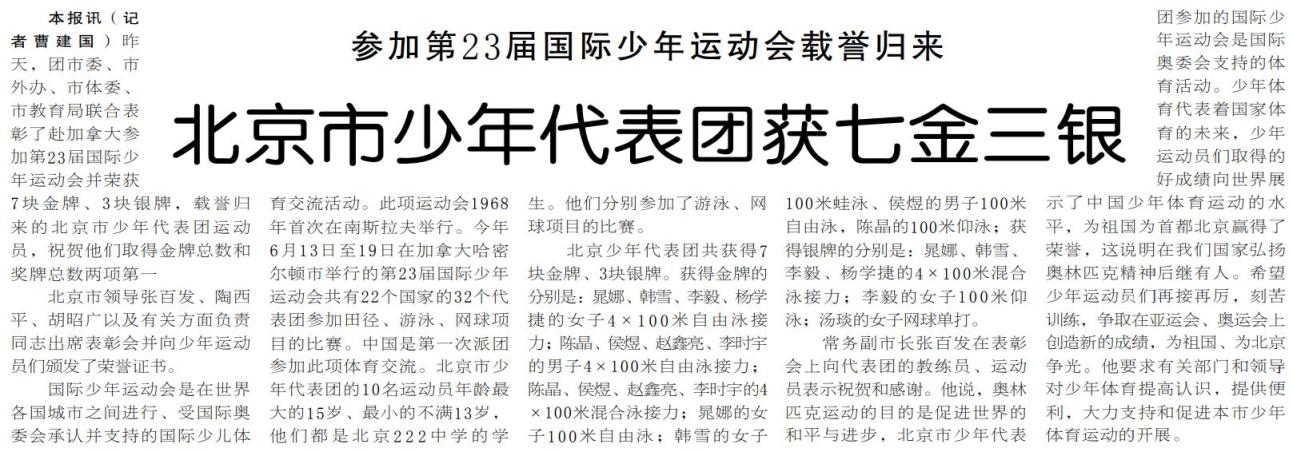 趣味运动不耽误人才选拔,竞技赛场上北京少年照样星光闪耀。1994年,10位北京少年组成代表团首次参加第23届国际少年运动会,在游泳、网球项目中一举斩获7金3银,取得金牌总数和奖牌总数第一的佳绩。这些来自北京222中学的孩子,年龄最大的15岁,最小的不满13岁,他们让国际赛场看到了中国少年的体育潜力。(1994年7月5日《北京日报》1版,《北京市少年代表团获七金三银》)