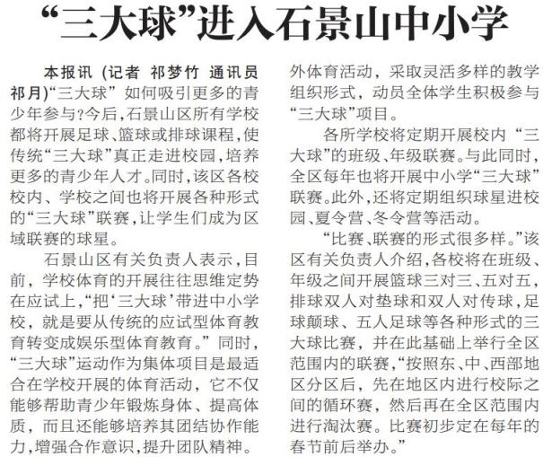 2010年后,常态化赛事让体育真正融入日常,班级联赛成为校园体育的主角。石景山区将足球、篮球、排球“三大球”纳入所有中小学的课程,班级间的篮球三对三、足球颠球赛轮番上演,让每一名学生都能站上赛场,过一把“校园球星”瘾。(2012年4月26日《北京日报》9版,《“三大球”进入石景山中小学》)校园赛事不再只比拼速度与名次,还加入了文明参赛打卡点、“最佳协作团队”评选、运动心得分享会等活动,让德育、美育融入体育,让赛场成为塑造品格、滋养成长的课堂。