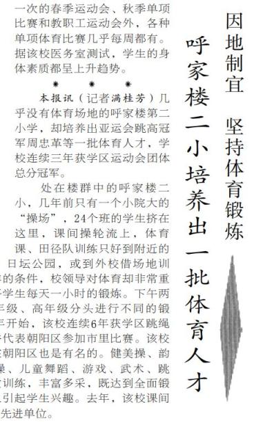 被密集楼群环绕的呼家楼第二小学,活动场地十分有限,全校24个班的课间操只能轮流做,体育课和田径队训练要辗转到附近的团结湖公园、日坛公园,或是向外校借场地才能开展。尽管条件艰苦,学校仍然使出浑身解数打造了健美操、韵律操、徒手操、儿童舞蹈、武术、跳绳等特色锻炼项目,既保证学生得到全面锻炼,又充分调动他们的兴趣。师生们用因地制宜的智慧证明了“只要想动,哪里都是运动场”。(1991年3月27日《北京日报》2版,《呼家楼二小培养出一批体育人才》)