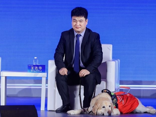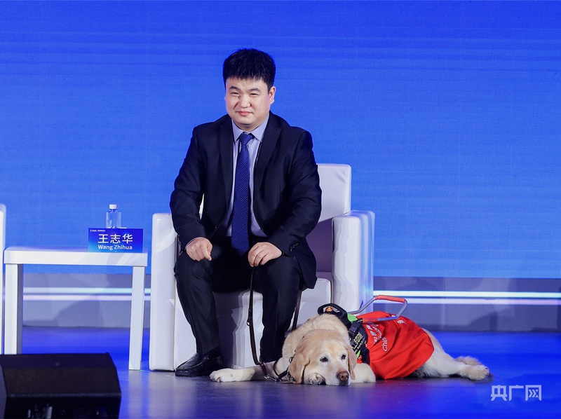 全国自强模范王志华和他的导盲犬“菠萝”(央广网发 中关村论坛供图)