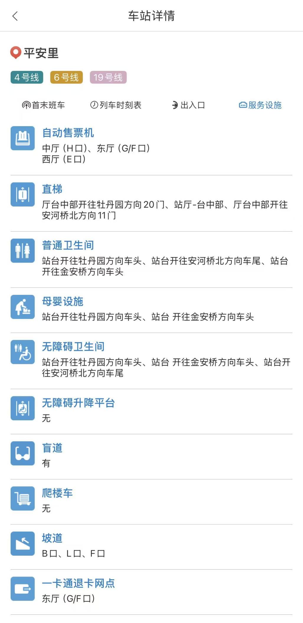 亿通行App为96123北京轨道交通官方App,通过“线路查询”选择地铁站后,在“车站详情”的“无障碍设施”中也可查看无障碍电梯所在的出入口,还可在“车站设施”中查看站内直梯和扶梯分布。