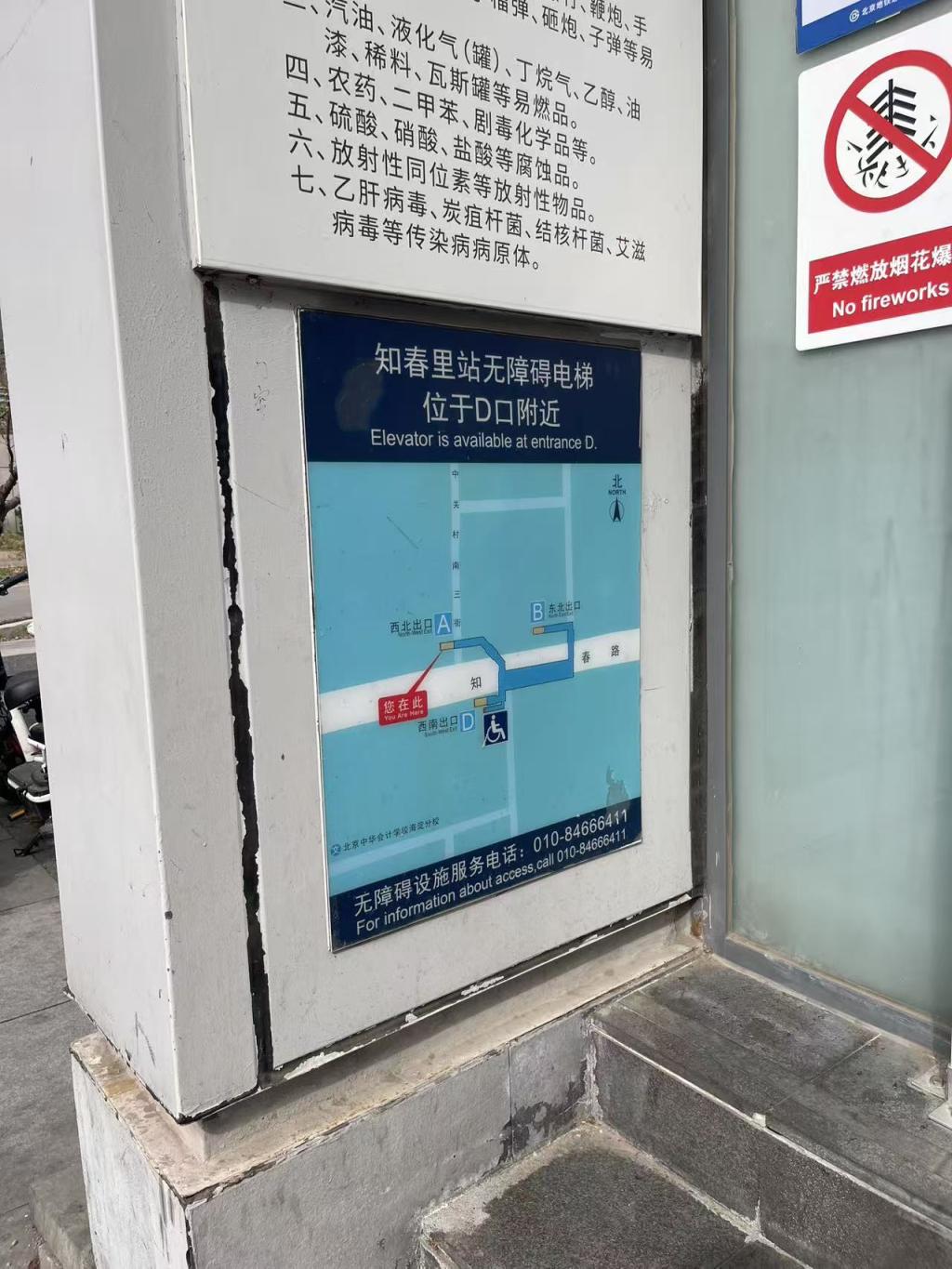 各站口张贴的无障碍电梯提示位置并不统一,有的在门左侧,有的在门右侧,还有的在站口侧面。导航软件通常就近定位地铁口,常有老人、行李旅客或推婴儿车的家长行至地铁口才发现:没有扶梯,只能步行下楼。